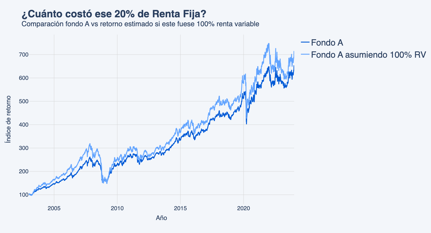 Hagamos el siguiente ejercicio; Asumiendo que el tipo de renta fija invertida en el fondo B es similar al del fondo A y están en su máxima exposición accionaria (que suele ser el caso), podemos hacer un pequeño sistema de ecuaciones y despejar el retorno del fondo A si tuviese 100% invertido en renta variable. Desde el 2003 hasta la fecha este portafolio habría rentado un 61% más que el fondo A original (0,46% anualizado), generando un aporte no menor al resultado final de las pensiones.