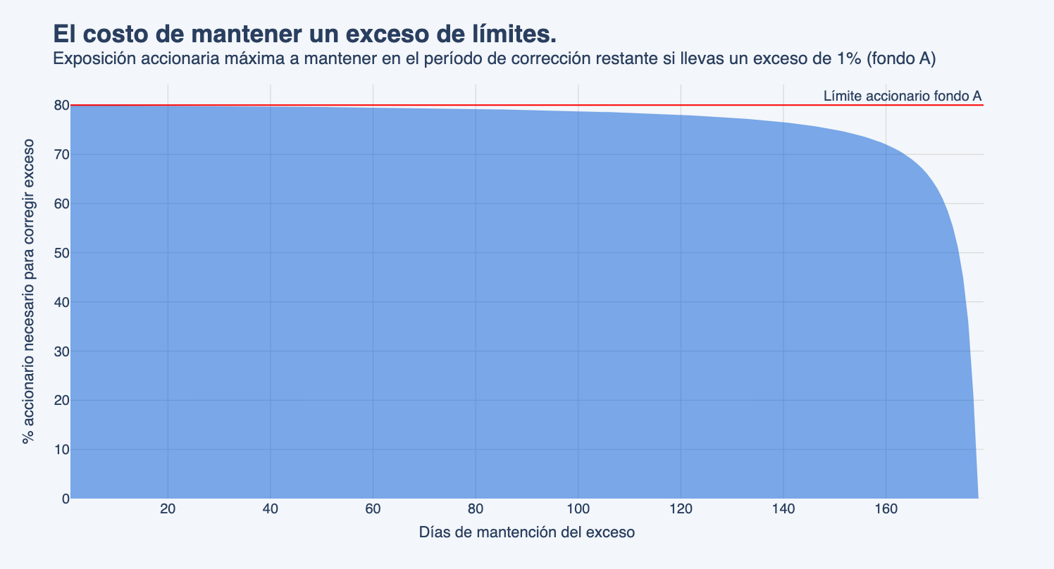 Por ejemplo, en el fondo A si generas un exceso de 1% accionario (81% total) y lo corriges inmediatamente, vas a tener que mantener una inversión de 80% durante los próximos 180 días, pero si te demoras (por condiciones de mercado, o como decisión activa) 90 días, el nivel máximo a mantener por el resto del período cae a 79%. El problema es que si este exceso se mantiene, el límite empieza a caer drásticamente, por ejemplo si el exceso sigue a 20 días de terminar el periodo estas forzado a bajar la exposición a 72%, cayendo asintóticamente hasta cero (incluso negativo).