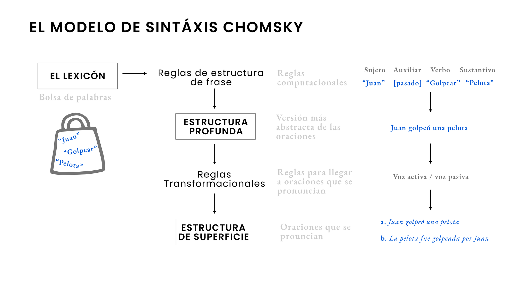 Esto significaba que las oraciones activas, como 'Juan golpea la pelota', y las oraciones pasivas, como 'La pelota es golpeada por Juan', eran en el fondo la misma oración. Ese fue uno de los grandes avances de la gramática generativa en aquella versión de 1965.