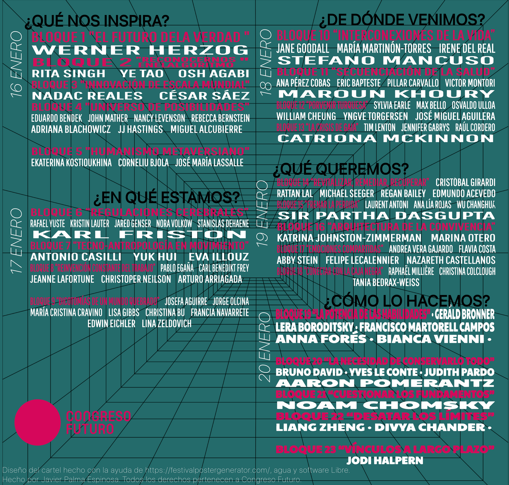 Por suerte, el Congreso Futuro ya no es más un evento de nicho. Ahora es un Lollapalooza. Este congreso, que se viene realizando desde el 2011 (al igual que el Lolla), y que solo traía a científicos, ahora congrega además a un montón de artistas, políticos, y personas destacadas en sus áreas, provenientes de todas partes del mundo y de todas las áreas del conocimiento, para conversar sobre lo que han estado haciendo en sus investigaciones, obras, o actividades (para mostrar su último disco, igual que Lolla). La gran diferencia es que este congreso dura una semana (JA!), será en un teatro, sin sol y sentado (JA JA!), y las entradas son gratuitas (JA JA JA!).