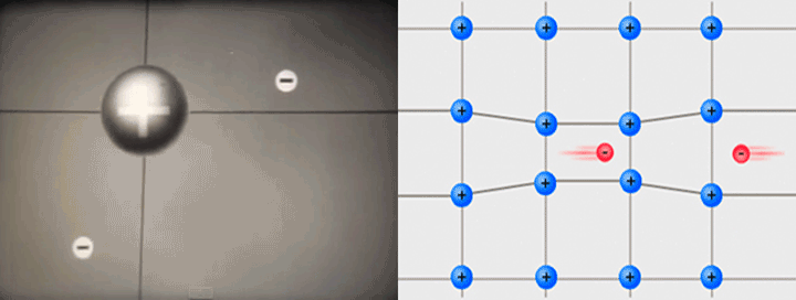 Como los electrones tienen carga negativa, los átomos (cargados positivamente) se ven atraídos al electrón deformando la red de átomos del conductor. Así, se forman vibraciones en la red donde hay una acumulación localizada de carga positiva.
