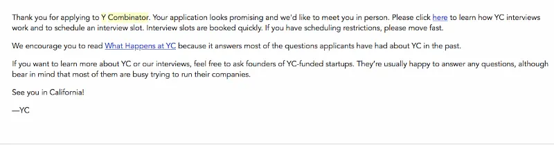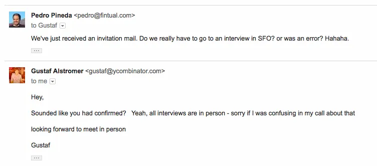 Un par de semanas después y sabiendo que leían todas las postulaciones pero que no prometían nada a quienes lo hacían fuera de plazo, nos llegó un mail para coordinar una reunión de 10 minutos por videoconferencia con un partner de Y Combinator.