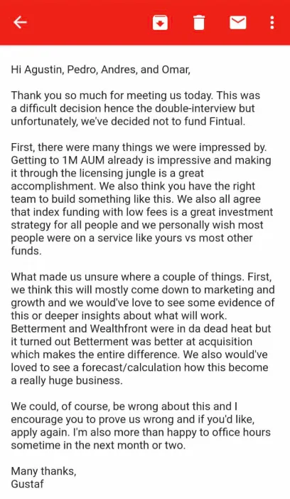 Hicimos simulacros de entrevista de 10 min con cercanos (gracias Deepak, Rafa, Ricardo) y desconocidos. Puse un aviso en linkedin pidiendo a cualquiera que supiera inglés bien y entendiera de startups, que nos escribiera a destroy@fintual.com para que nos destruyera a preguntas (gracias Sheldon y Jaap).