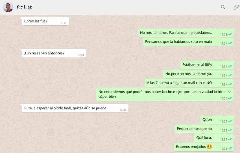 18:33: Agustín se va al baño deseando que al volver, el teléfono ya haya sonado. Yo empiezo a decir que ya no quedamos, que en YC siempre han sido puntuales con todo, que ya fue. Y le empiezo a contar por Whatsapp a mis más cercanos en Chile que estaban expectantes por saber.
