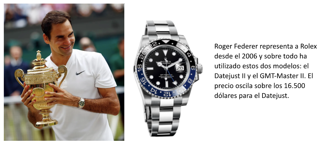Si trabajaras en una empresa de relojes y quisieras publicitarte a gran escala, ¿dónde lo harías? «El deporte une masas», ¿verdad? Así que sería una buena estrategia, pero… ¿En qué deporte? Los requisitos son claros: tiene que lucirse la muñeca constantemente y que no se pueda golpear o dañar con facilidad. El tenis, obviamente se viene a la mente. Es un deporte que se juega con las manos, no hay demasiado contacto que pueda dañar un reloj y los jugadores son admirados y respetados en todo el mundo. Parece la combinación perfecta.