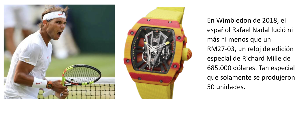 Nobleza obliga decirlo también, en general los tenistas no usan los relojes durante los partidos salvo que sean de exhibición; es bien común ver que se los ponen cuando termina el partido para la foto. Una excepción son los Richard Mille de Rafael Nadal, les podrán gustar o no sus diseños posmodernos, pero tienen complicaciones de relojería fina como un tourbillon con un peso de sólo 3,83 g (un Rolex pesa aprox. 150g) y resistencia digna de un G-Shock. Eso “justifica” según sus fabricantes, sus precios de locura.
