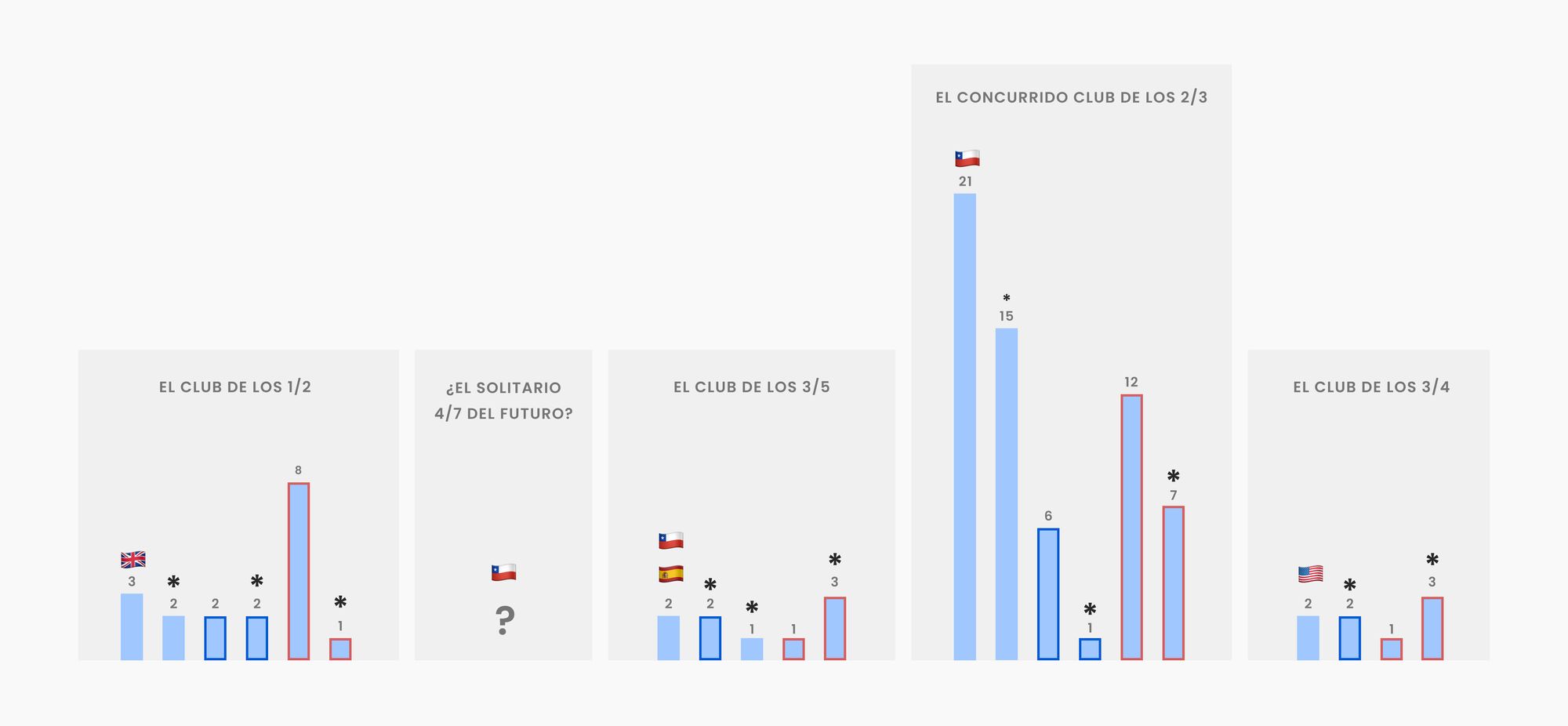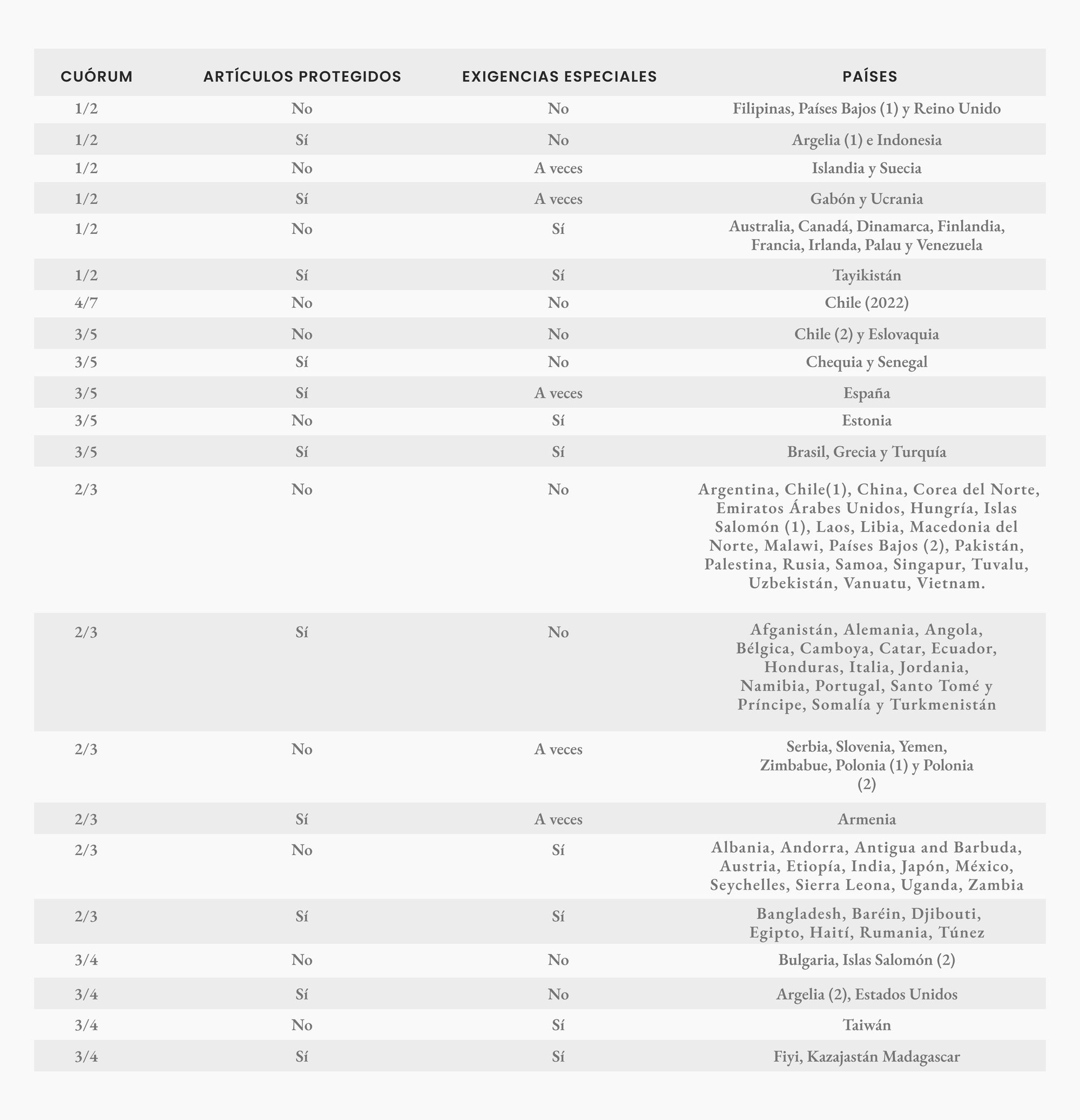 - El cuórum, que pretendía ser el único componente de esta columna. Pero incluso esta condición fundamental es más enrevesada de lo que parecería a simple vista. Ciertas constituciones —como la chilena vigente, sin ir más lejos— exigen cierto cuórum para algunas secciones y cierto cuórum para otras secciones. En tal caso, los países han sido divididos en dos, y por eso la bandera chilena aparece dos veces, tanto en el club de los tres quintos como en el de los dos tercios.