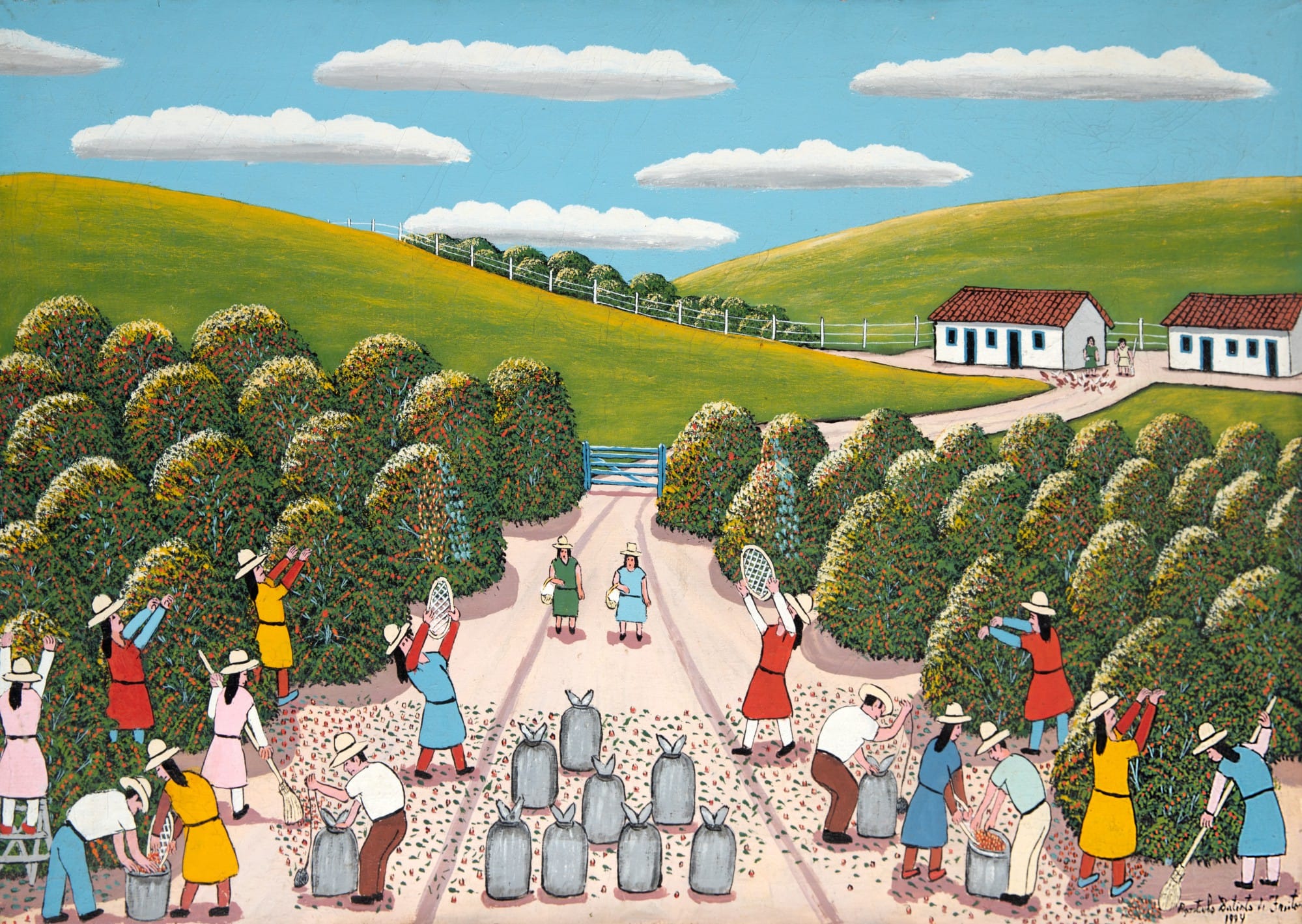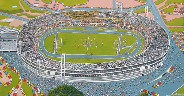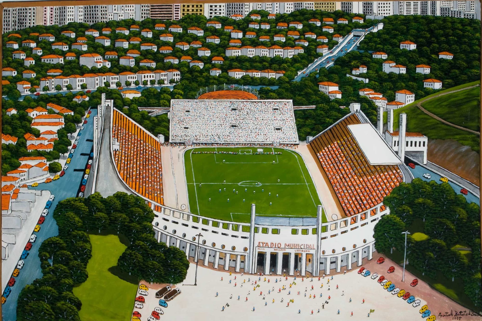 Autos, vistas aéreas, edificios y lugres emblemáticos, personas. Todo lo que compone una ciudad en crecimiento constante y desenfrenado –como lo era Sao Paulo en los años cincuenta– aparece en las pinturas de Agostinho. Pero como decía antes, la ciudad aquí no parece ser ese ente opresivo y anonimizante, sino también un lugar de encuentro y la base del tejido social.