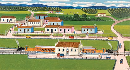 Autos, vistas aéreas, edificios y lugres emblemáticos, personas. Todo lo que compone una ciudad en crecimiento constante y desenfrenado –como lo era Sao Paulo en los años cincuenta– aparece en las pinturas de Agostinho. Pero como decía antes, la ciudad aquí no parece ser ese ente opresivo y anonimizante, sino también un lugar de encuentro y la base del tejido social.