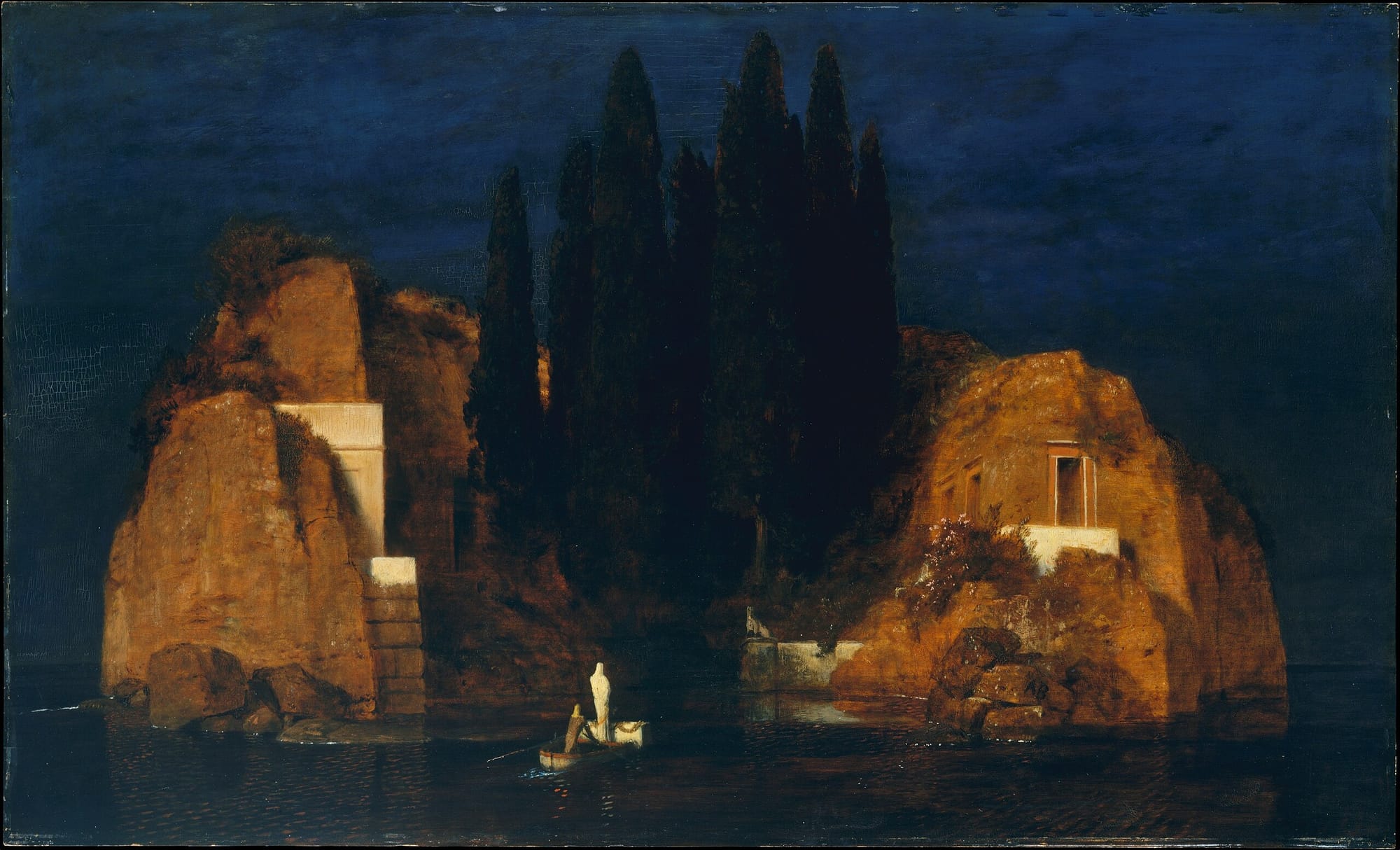 De una inspiración similar saldría su pintura(s) más famosa: La isla de los muertos, una obra que revisitaría varias veces, convirtiéndola en una serie muy influyente en su época. El tema es, obviamente, mitológico: Caronte, el barquero de los muertos, lleva a un alma recientemente fallecida vestida de blanco hacia su próximo destino. Böcklin, como buen Lyncheano, nunca explicó el simbolismo ni el tema de su pintura, ni siquiera él le puso ese nombre, de hecho (lo hizo el pasante de arte que vendió la pintura).