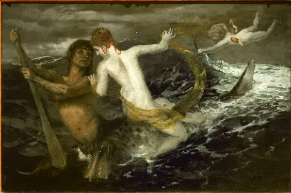 Y no estarías tan lejos de la realidad: Arnold Böcklin nació en Basilea, Suiza, el año 1827. Venía de una familia escafulense –que proviene del cantón de Schaffhausen– y rápidamente comenzó a trabajar como pintor de paisajes. Pero en algún momento de su adolescencia tardía viajó a Génova y Roma, y el contacto con el mediterráneo y la historia latina marcarían un primer volantazo en su pintura: se enamoró de las figuras mitológicas y alegóricas, que empezó a incluir en su obra.
