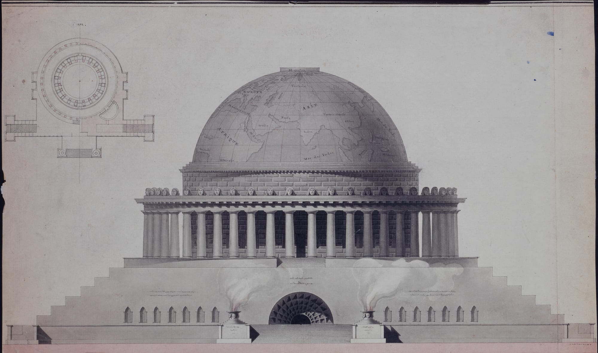 La respuesta: Étienne-Louis Boullée, un arquitecto bastante famoso en sus días, pero que pasó más tiempo enseñando que construyendo. Y era que no: sus edificios –o propuestas de edificios– eran totalmente desquiciadas, tanto en tamaño como en la fisicalidad que los sostenía.
