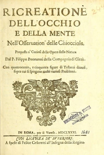 Durante esos años Bonanni creó la primera guía práctica ilustrada para coleccionistas de conchas, con el llamativo título de Recreatione dell'occhio e della mente (1681). Esta guía, en dos volúmenes, fue el primer tratado dedicado íntegramente a los moluscos e incluyó numerosos grabados.