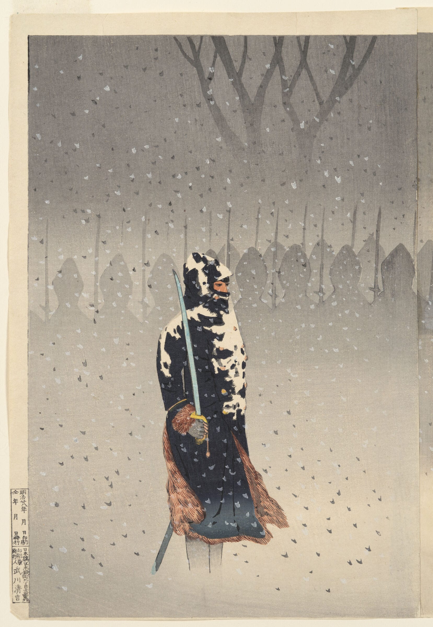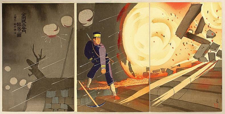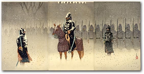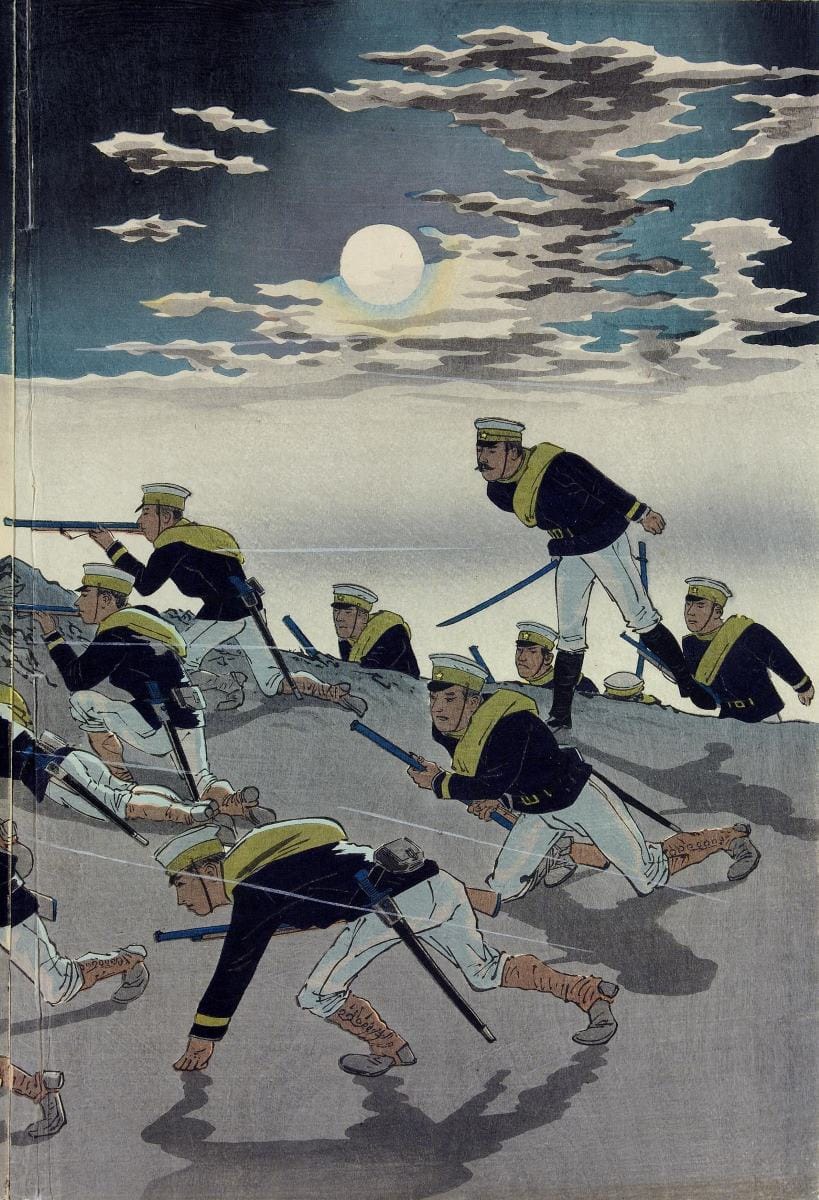 Kobayashi Kiyochika luchó en la Guerra Boshin, conocida también como la Guerra Civil Japonesa. El conflicto enfrentó a las fuerzas pro-imperiales y al shogunato gobernante Tokugawa. Kiyochika estaba en las filas del bando perdedor, el shogunato. Y después de la derrota –y la consecuente Restauración Meiji– se retiró a la provincia durante seis años.