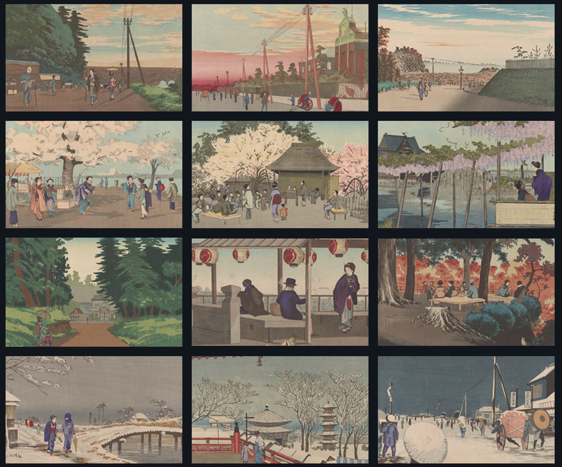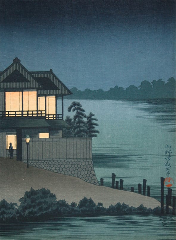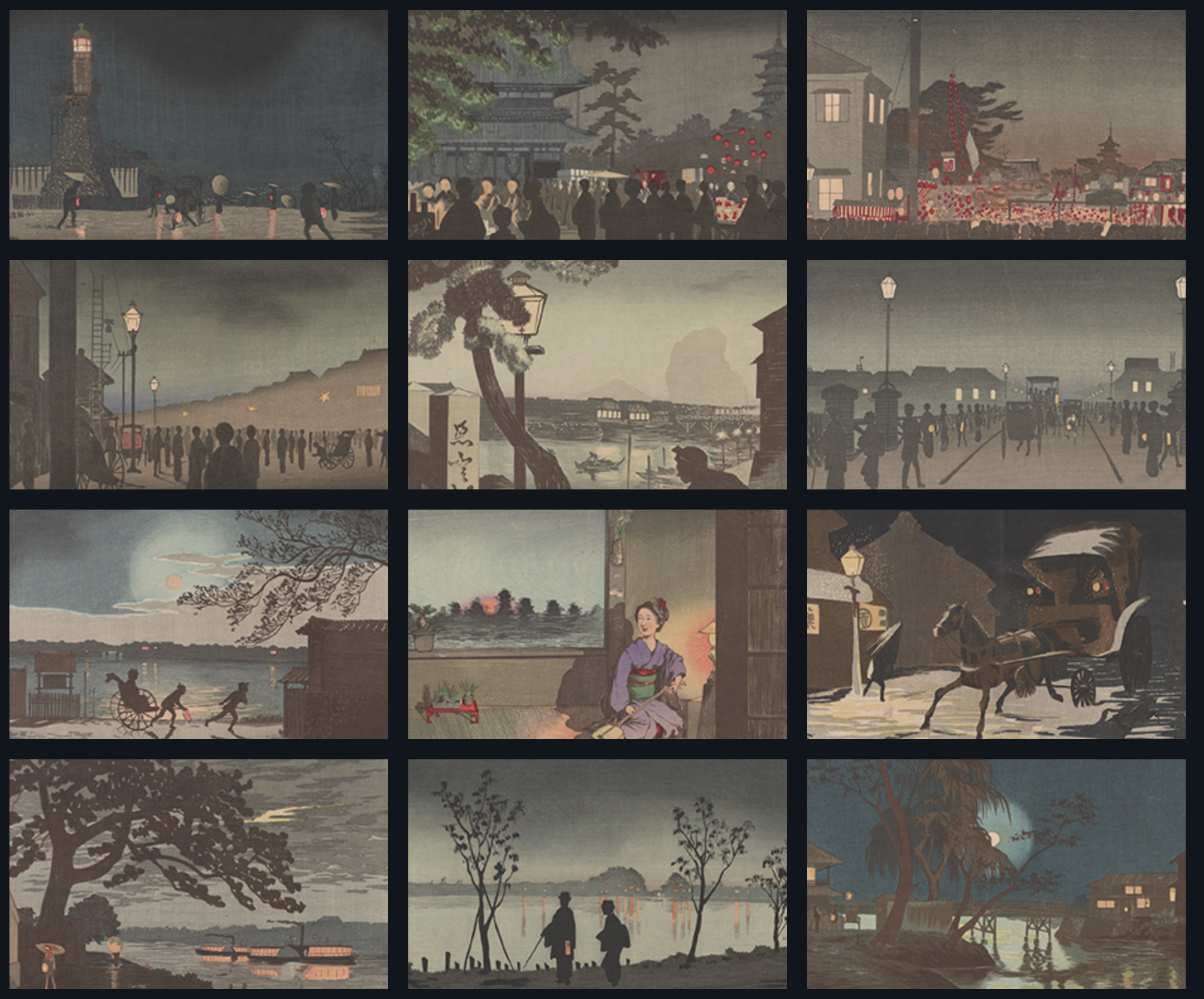Famosas son sus pinturas de Tokyio de día y de noche, una serie de impresiones en madera que muestran lo que significaba para los artistas de la época poder "mirar" las 24 horas.