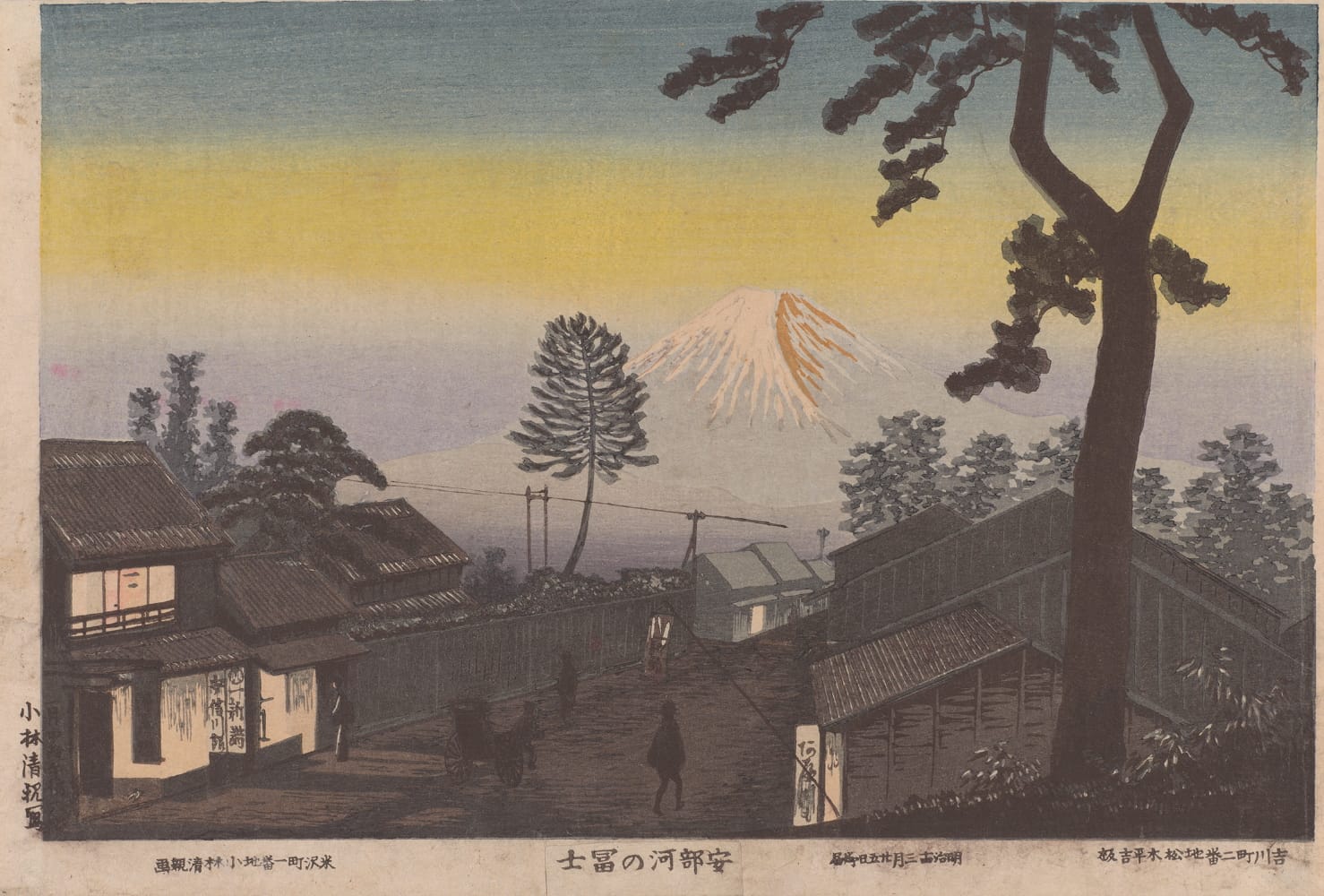 Incluso en su versión del Monte Fuji (una temática que al parecer todos los pintores japoneses tienen que visitar alguna vez en su carrera), se pueden ver detalles que marcan el cambio de época: el cableado de las líneas telegráficas.