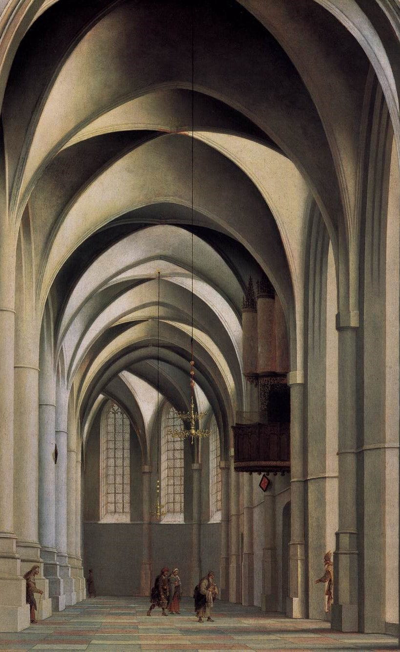 Saenredam nació en pleno Siglo de Oro neerlandés. Pero a diferencia de Rembrandt y sus contemporáneos, no quiso dedicarse a pintar a la incipiente burguesía que definiría los modos y formas del capitalismo moderno. Tampoco se lanzó a pintar paisajes bucólicos llenos lagos, montañas en lontananza y nubes totalmente imposibles.