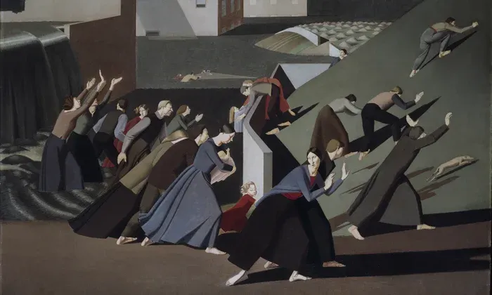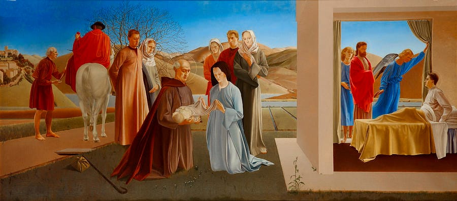 Pero también se pueden apreciar algunas figuras alargadas, ataviadas con vestidos largos, todas relativamente similares –como en una pintura de Lowry, el de los palitos de fósforos–. ¿De dónde venía el estilo? La fuente de todo era una de las obsesiones de Knights: el Quattrocento italiano.