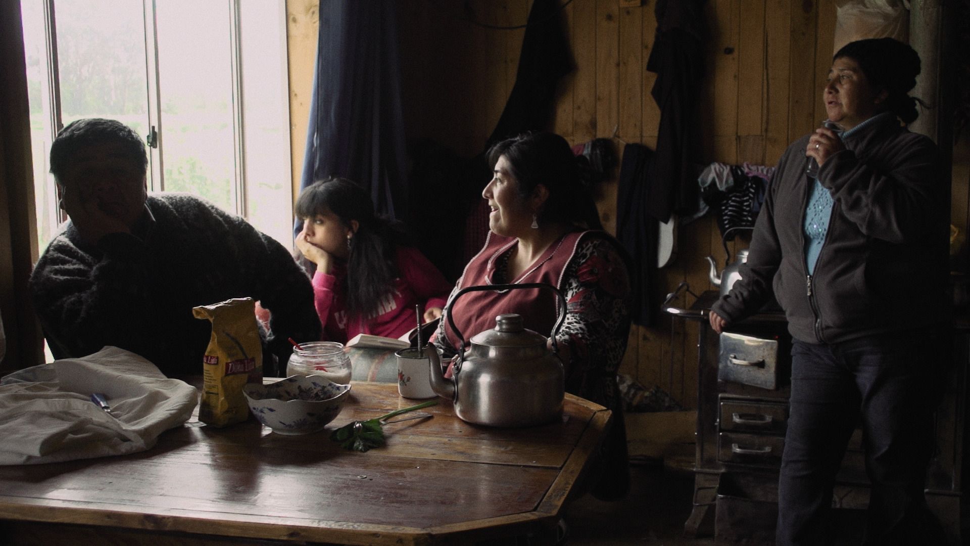 La película parece obsesionada con estas particularidades. Dentro de su casa, vemos a la familia tomar once, hervir agua y cocinar mientras nos sumergimos en sus conversaciones. A través de comentarios sueltos entendemos la situación en la que se encuentran. La amenaza de mapuches que piensan distinto sobre cómo relacionarse con el Estado chileno, el riesgo mortal que significa estar en el medio.