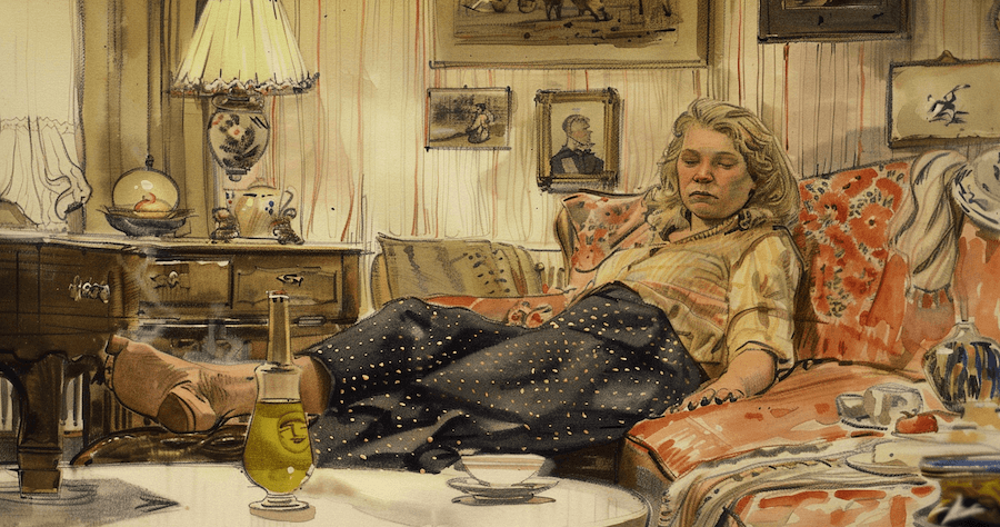 Si sus temáticas las podemos rastrear en su infancia, entonces su estilo lo podríamos encontrar en su adolescencia: hay un cierto aire a caricatura y otro poco de humor en sus pinturas e ilustraciones. Y ya que estamos, no podemos dejar de mencionar sus años trabajando como decorador de interiores, que se puede apreciar en obras como esta: