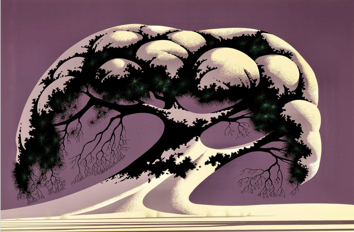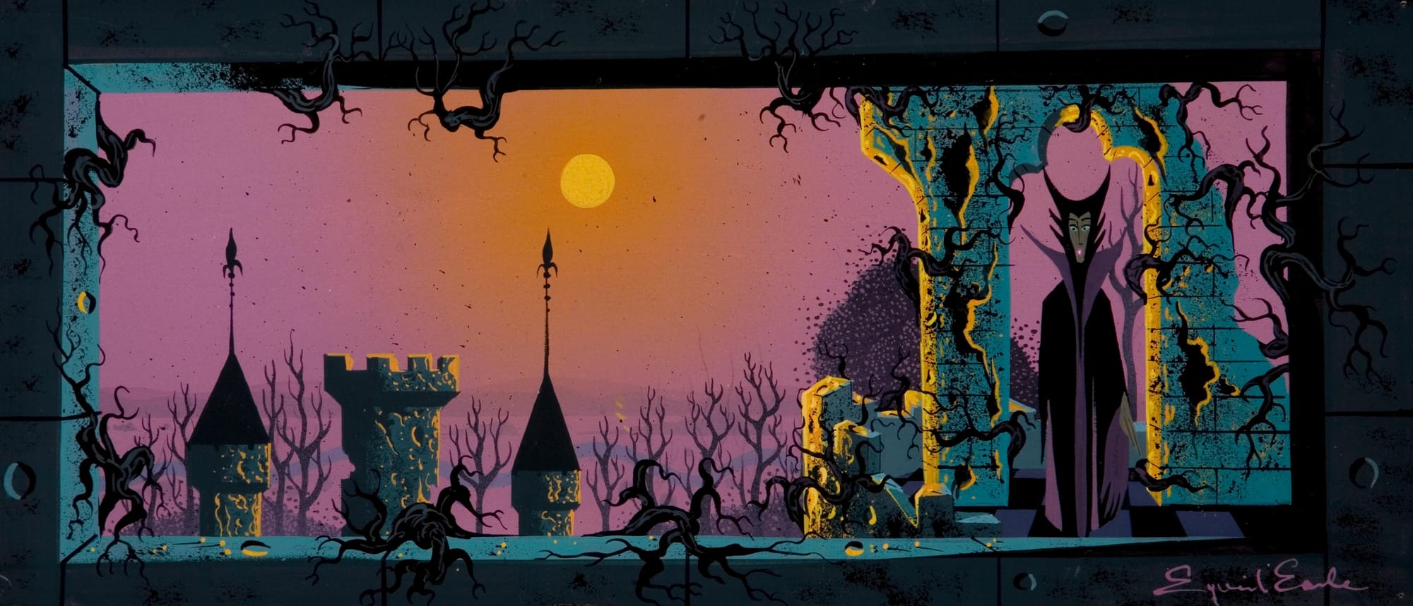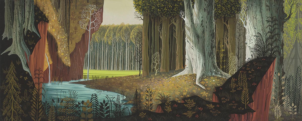 Esta pequeña escena familiar que espero mi hija olvide para siempre se me vino a la mente cuando un colega me sugirió el nombre de Eyvind Earle como artista de la semana. Un dibujante y pintor que se encargaba de los conceptos y fondos para las películas de Disney de los años 50.