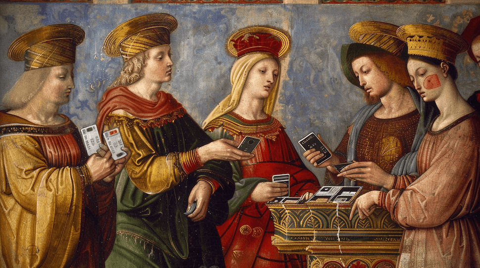 Lo interesante de replicar su estilo con IA es que es muy fácil incorporarle anacronismos: partimos con algunas tarjetas de crédito para este post sobre cómo se mueve el dinero en Chile: