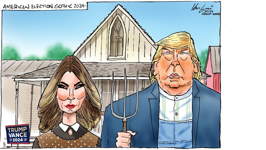 Y elegimos Wood para esta semana, porque va muy bien con las últimas noticias de Trump. No somos los primeros en asociar al presidente de Estados Unidos con Wood. Su obra patriótica, que destaca el paisaje y a los trabajadores en la zona rural de Estados Unidos, pareciera ir perfecto con el slogan "make America great again". Por eso el caricaturista Mark Knitght de The Herald Sun, hizo su propia versión de Amercan Gothic para las elecciones del 2024: