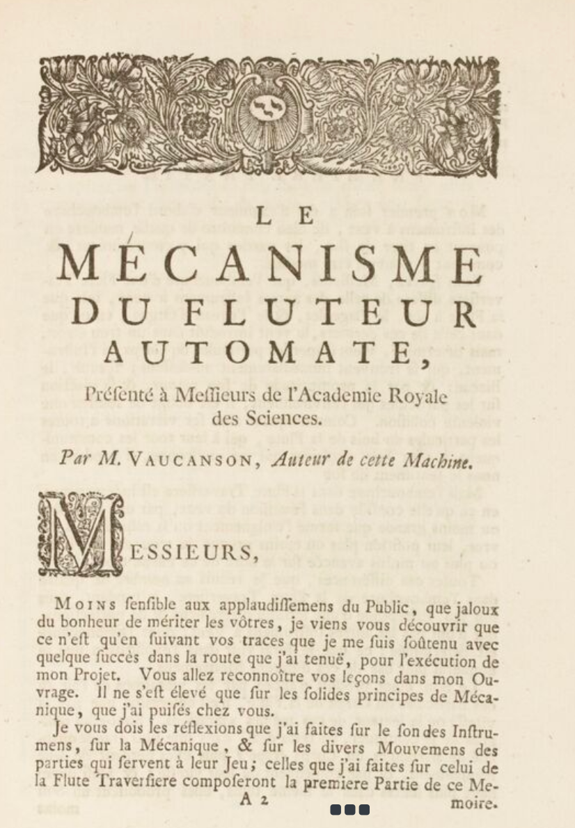 El flautista, que se inauguró en febrero de 1738 en el gran salón del Hôtel de Longueville en París, causó sensación, como era de esperarse. La Academia Real Francesa de Ciencias completa pasó a verlo. Y fue tanto el éxito, que le pidieron a Vaucanson que escribiera un libro –lo que podría ser hoy en día un paper académico– explicando su funcionamiento.