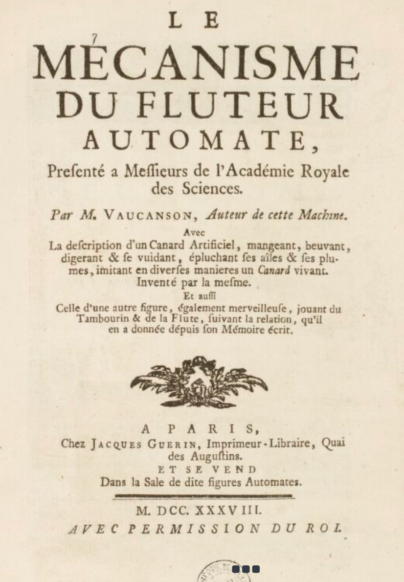 Y en 1709 nacía en Francia Jacques de Vaucanson, tal vez el creador de autómatas más celebre de la historia –hasta que llegó Sam Altman con su GPT, hay que decirlo–. Cuando niño vivió bajo la tutela de los jesuitas, y todo indicaba que seguiría el camino religioso hasta que fue dispensado de sus votos por problemas digestivos... algo que se volvería manifestar en su arte más adelante.