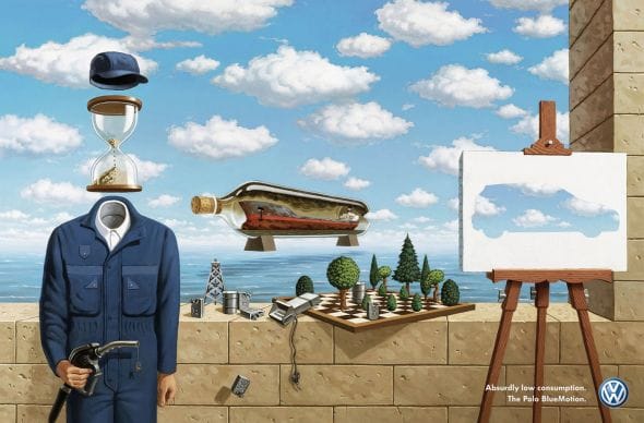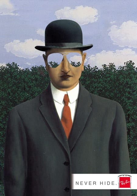 Volswagen, Ray-Ban, Allianz, los Beatles e incluso la CBS, se valieron de la obra de Magritte para diseñar su publicidad. O si prefieres, una escena de la película de Almodóvar, Los abrazos rotos.