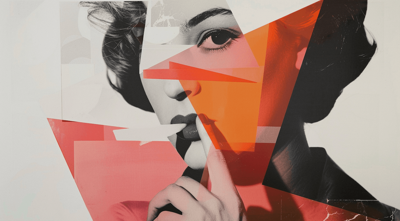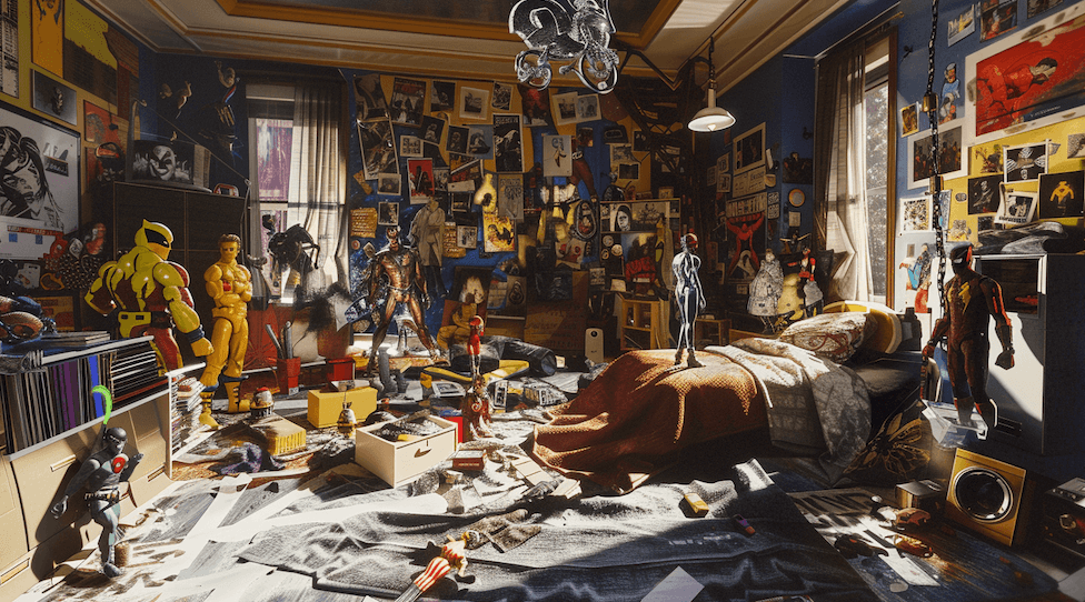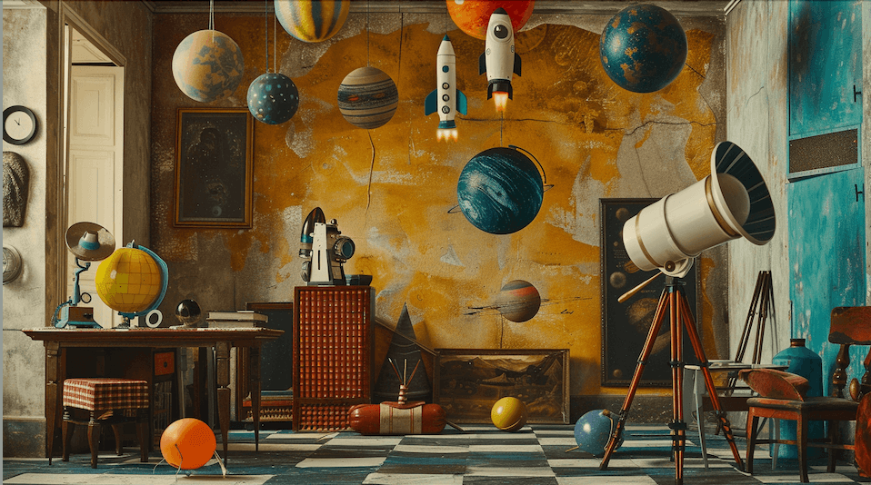 an image inspired by the style of Richard Hamilton, paying careful attention to his characteristic brushwork and color palette. The composition portrays a classic room as a backdrop, serving as a canvas for the collage-style overlay. Within this surrealistic scene, introduce a telescope, toy planets hanging from the cealing and rockets. Embrace the whimsical juxtaposition of these objects, playing with scale and perspective to create a visually captivating narrative. Infuse the scene with Hamilton's trademark vibrancy and dynamism, using bold strokes and rich hues to evoke the essence of his artistic legacy.a Richard Hamilton collage of a woman making the silence gesture with her finger over her mouth with a white backgrounda collage by Richard Hamilton of the Middle East as a puzzlea collage by Richard Hamilton where you can see Marvel X-Men figures around a bedroom --ar 16:9