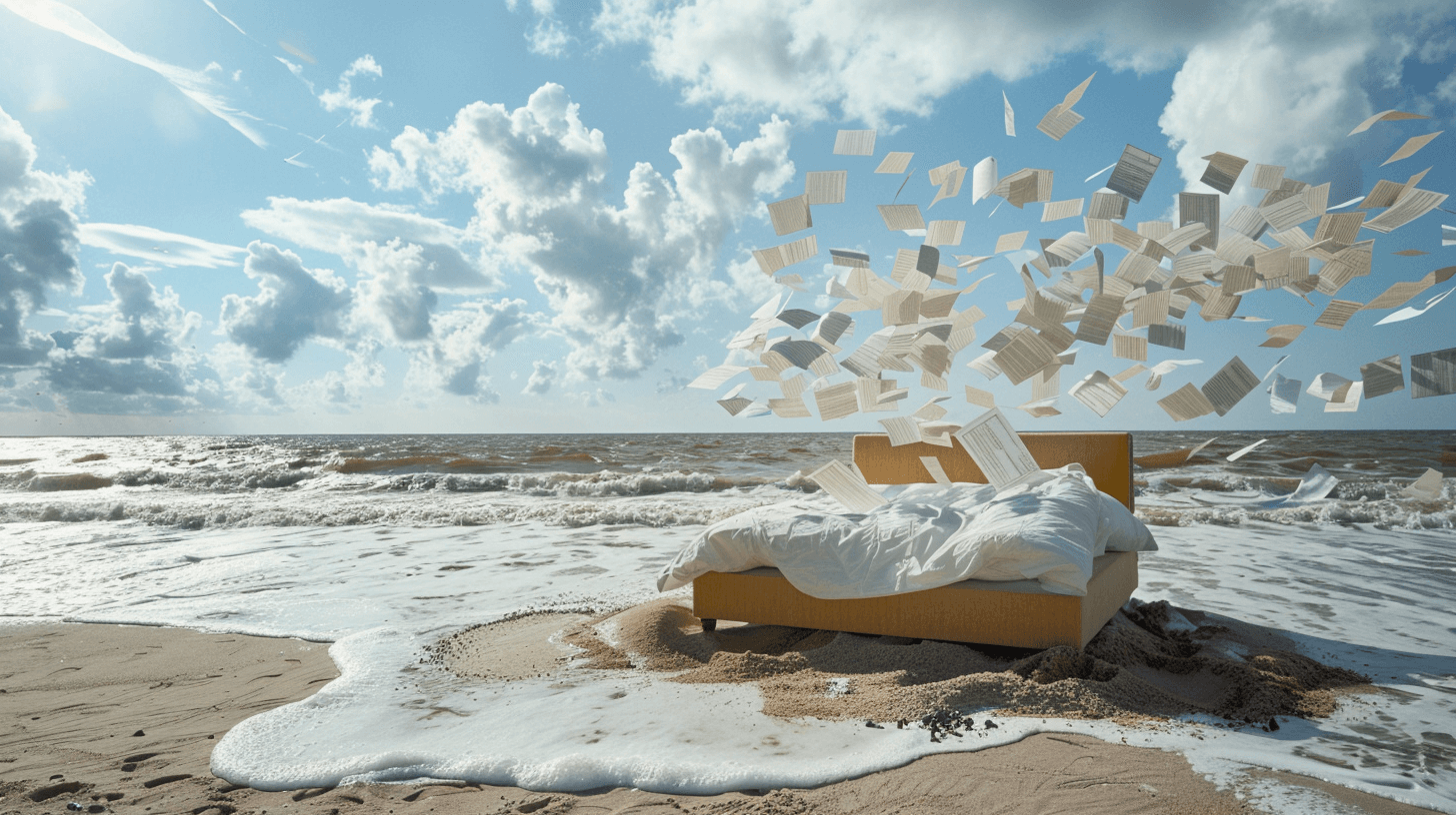 a Storm Thorgerson installation inspired by 2001 Space Odyssey with the monolith in the middle of a dessert and two man looking into each other seen from afara Storm Thorgerson installation of a bed in the middle of the beach followed by hundreds of flying papers representing the tax returnsa Storm Thorgerson installation about a tower of coins being dropped from the sky inside a Federal buildinga Storm Thorgerson installation of a movie theater with seats and a screen in the middle of nowhere with a bright day with some cloudsa Storm Thorgerson installation of a woman driving an Oldsmobile in the rain in the middle of Missouri