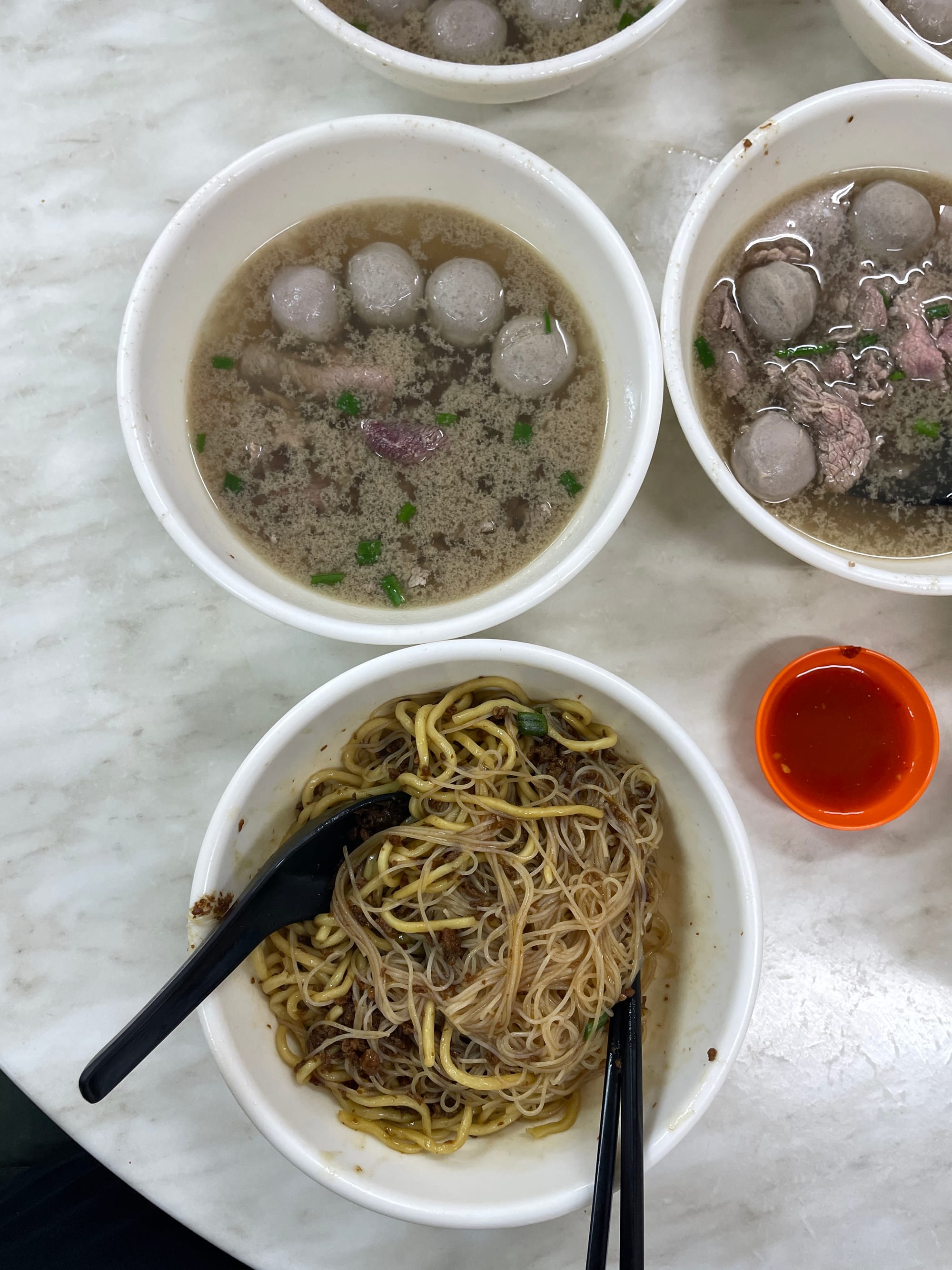 La mañana siguiente me exige algo que me recomponga de la noche anterior. El cuerpo pedía un plato que hablara en el mismo idioma del cansancio. Fuimos a Ah Hei, donde el clásico es el Bak Kut Teh, hecho con costillas de cerdo, albóndigas y panceta. El caldo lleva horas hirviendo, oscuro y profundo como un consomé que se ha concentrado desde el amanecer. Se sirve con arroz jazmín, que envuelve la mesa con su aroma floral, y una salsa de soya espesa, picante y dulce al mismo tiempo.