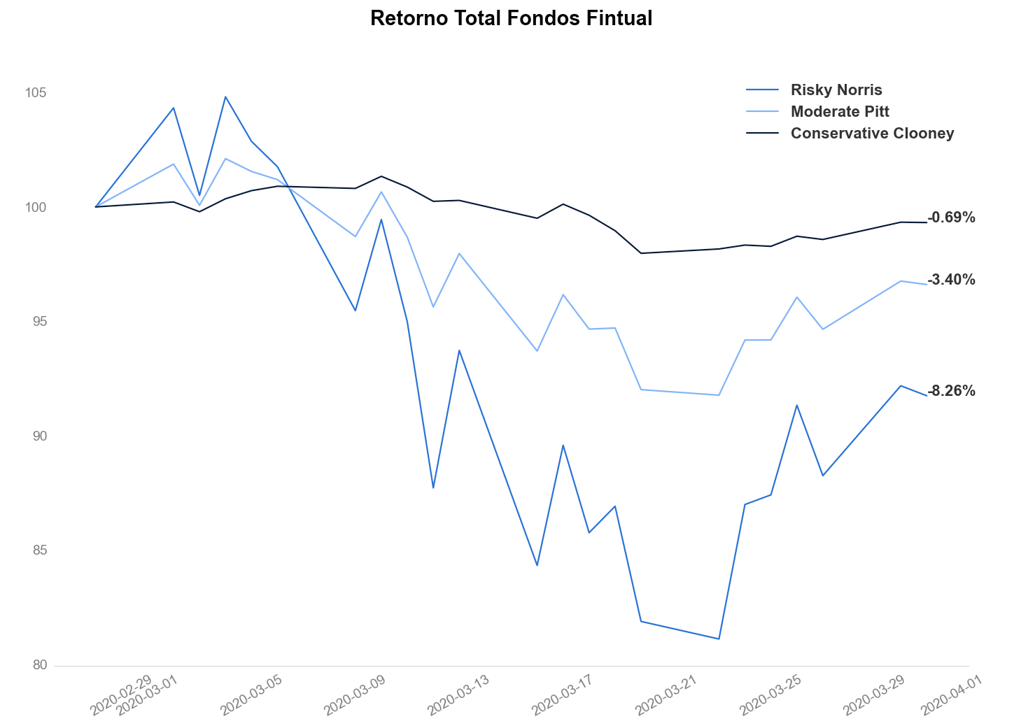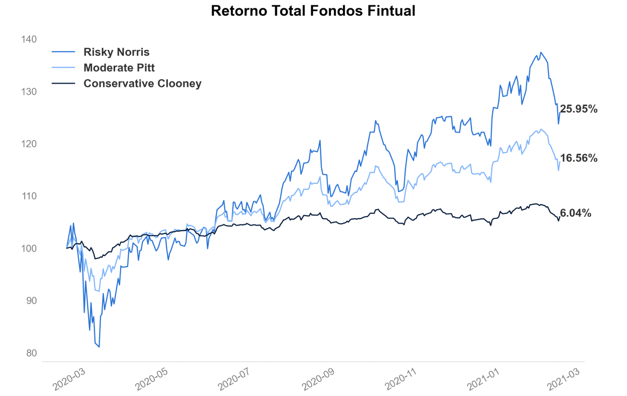 Hace un año los mercados estaban viviendo una de sus peores caídas en la historia reciente. La baja partió en febrero y siguió durante casi todo marzo. De hecho, Risky Norris —el fondo más riesgoso de Fintual— cayó -8,26% en marzo del 2020. El fondo conservador, Conservative Clooney, rentó apenas -0,69% el mismo mes.