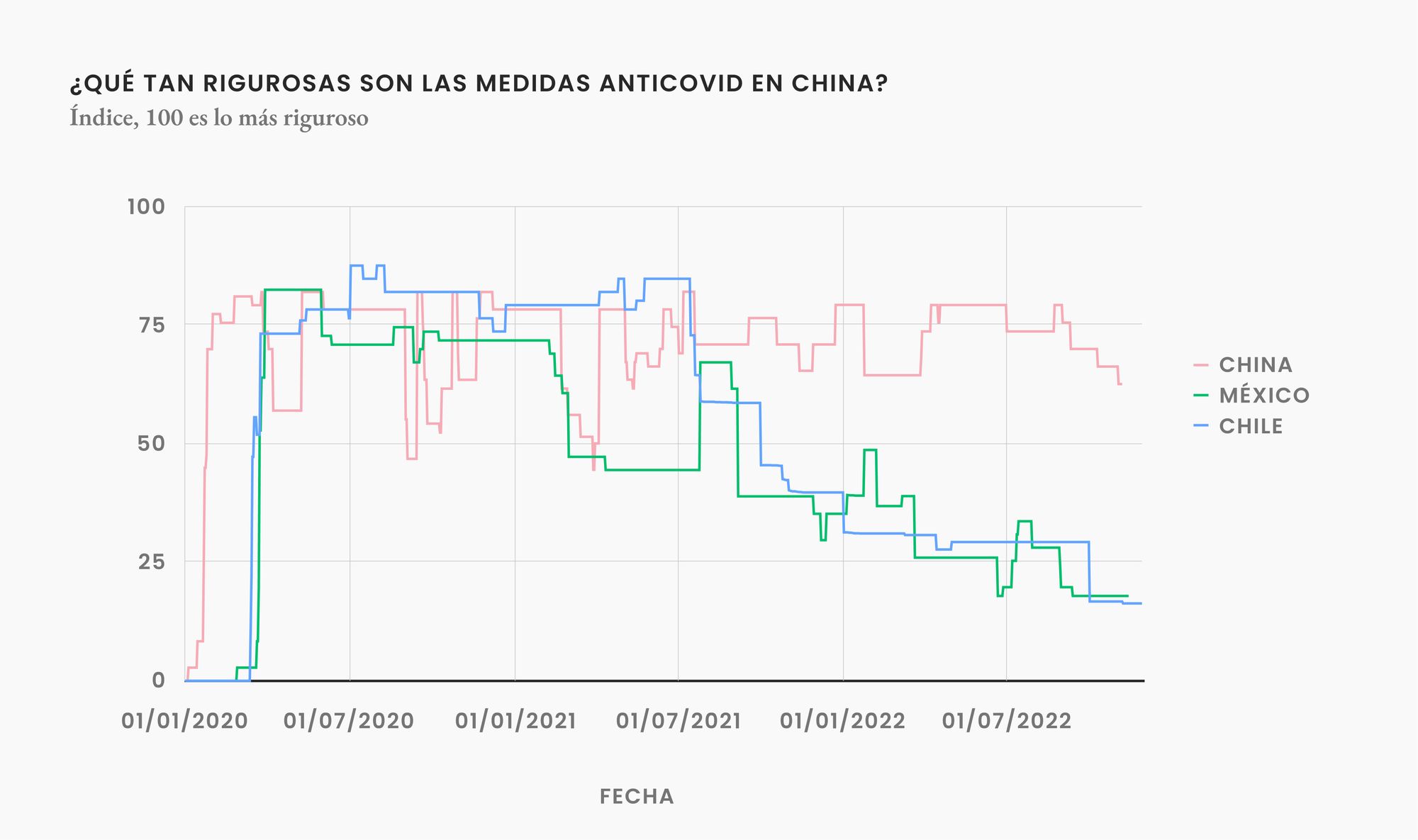 La Universidad de Oxford creó un índice, que usa nueve métricas (cierres de escuelas, cierres de lugares de trabajo, cancelación de eventos públicos, restricciones a las reuniones públicas, cierres de transporte público, imposiciones de quedarse en casa, campañas de información pública, restricciones a los movimientos internos y controles de viajes internacionales) para calcular, de 1 a 100, qué tan rigurosas son las medidas impuestas por el gobierno. Según este índice, China es el país del mundo con las medidas más estrictas.