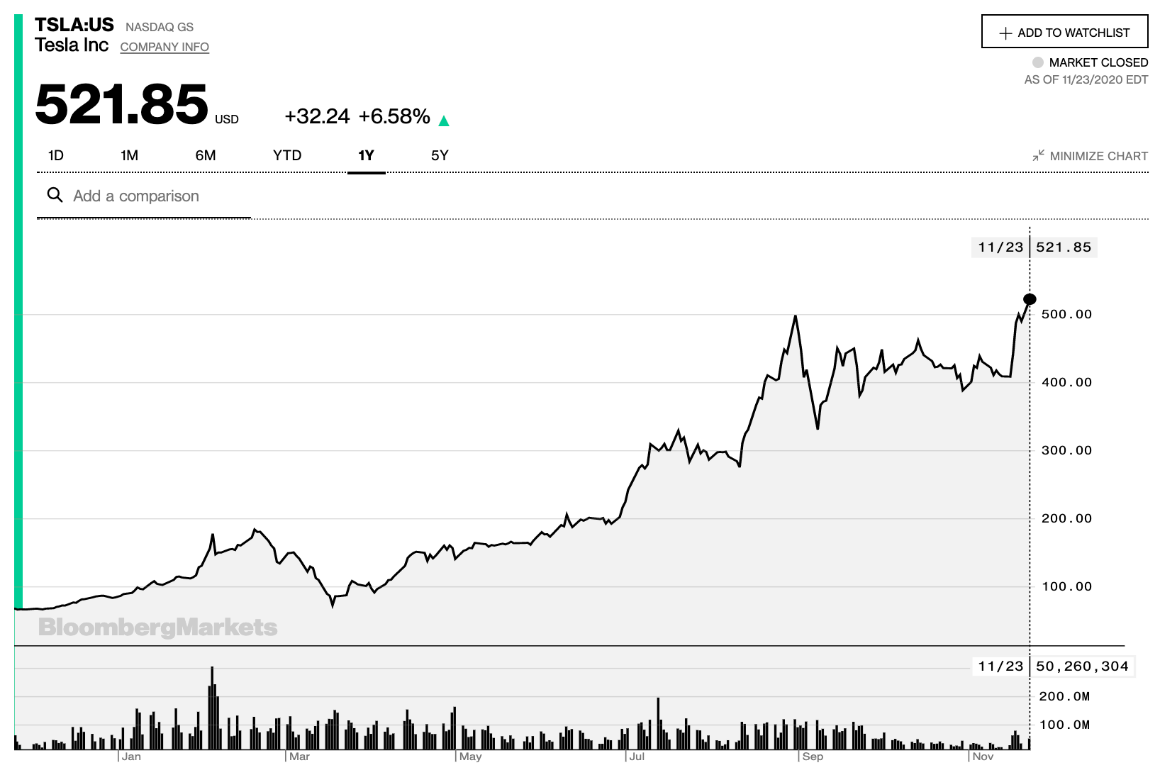 Tesla empezó el año 2020 con un valor de mercado (que es cantidad de cuotas multiplicado por valor cuota) de cerca de $81 mil millones de dólares y el 24 de Noviembre 2020 ya valía casi de $495 mil millones. Esa valorización hace que Tesla sea la empresa de automóviles más preciada del mundo. Es más, tiene un valor de mercado de más del doble que la segunda empresa más grande de autos, Toyota Motor Corp (TM), la cual se valoriza en alrededor de $200 mil millones.