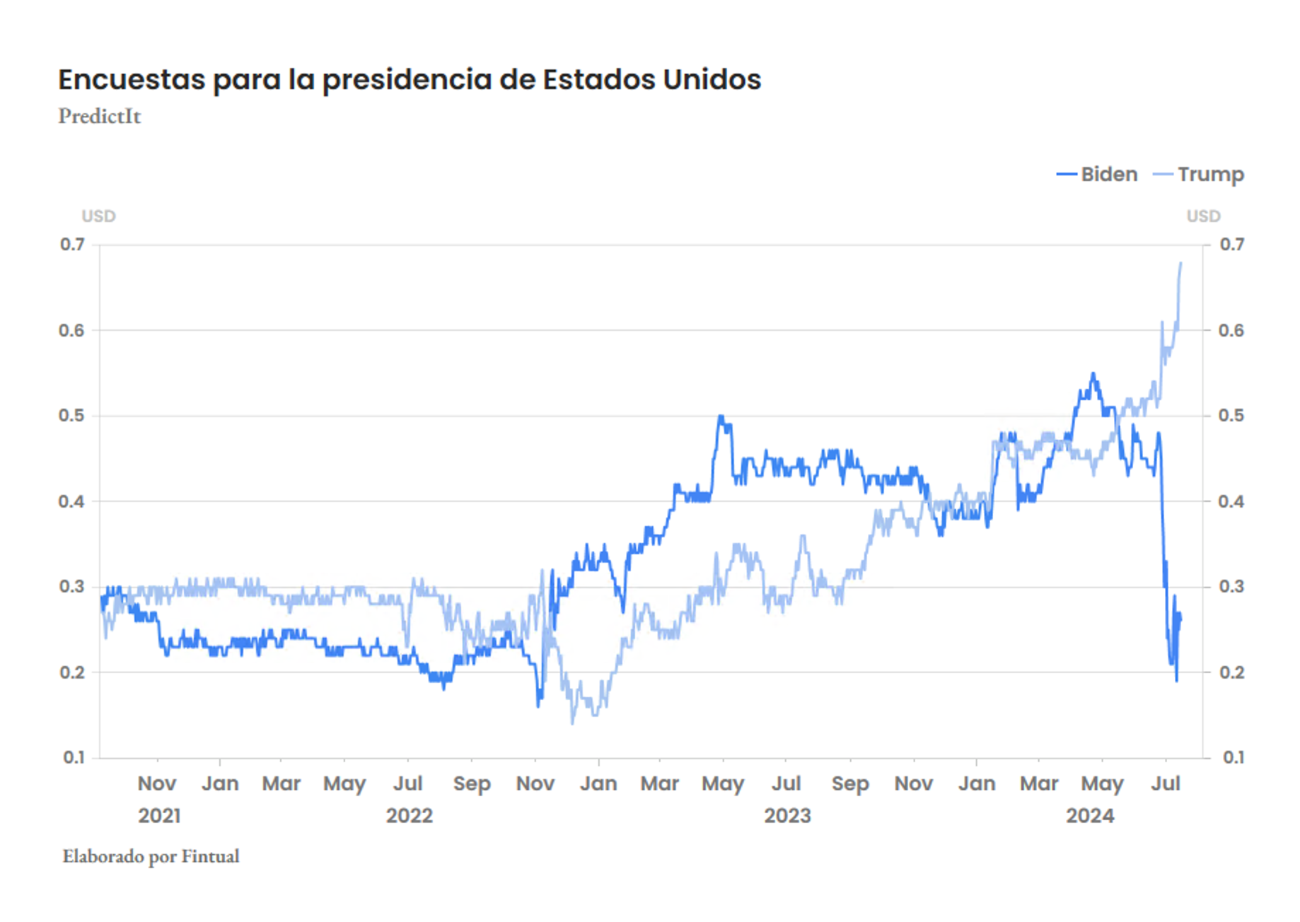 Eso sí, nada está escrito en piedra aún. Los ojos del mercado, analistas y votantes están en si esto orilla a Biden a dar un paso al lado en la carrera. Lo que sí es esperable es que haya volatilidad en los precios de los activos ligada, principalmente, a las trayectorias fiscales y los riesgos de sostenibilidad fiscal de largo plazo.