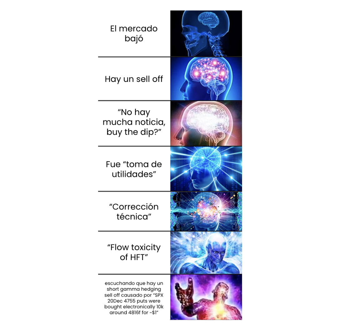 Si bien fue una caída significativa, en el mercado no se escuchan muchos motivos detrás de este movimiento. En particular, un comentario que nos llamó la atención en la mesa de dinero fue una supuesta venta de opciones de S&P 500 con el fin de cubrir el riesgo de algunos participantes de mercado. Como sea, este tipo de argumentos “sofisticados” suelen aparecer cuando el mercado no encuentra una explicación razonable a la volatilidad diaria que experimentan los precios de las acciones. Estos argumentos “inteligentes” los ilustramos en el siguiente meme: