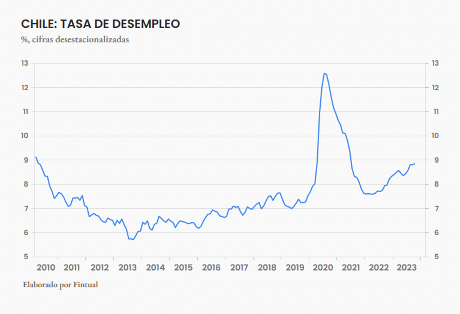 El miércoles se publicaron los datos del mercado laboral en Chile. La tasa de desempleo se mantuvo en 8.9% en el trimestre móvil de ago-oct, igual que el trimestre móvil anterior. Ajustado por estacionalidad la tasa subió a 8.9% desde el 8.8% del trimestre previo. Desde el mínimo de 7.6% que alcanzó en 2022, la tasa de desempleo ha subido 1.3 puntos porcentuales. Esta debilidad en el empleo está ligada a la desaceleración económica por la que atraviesa Chile, aunque, por suerte, recientemente las cifras de crecimiento han mejorado, lo cual podría significar que la situación del mercado laboral también pronto mejore.