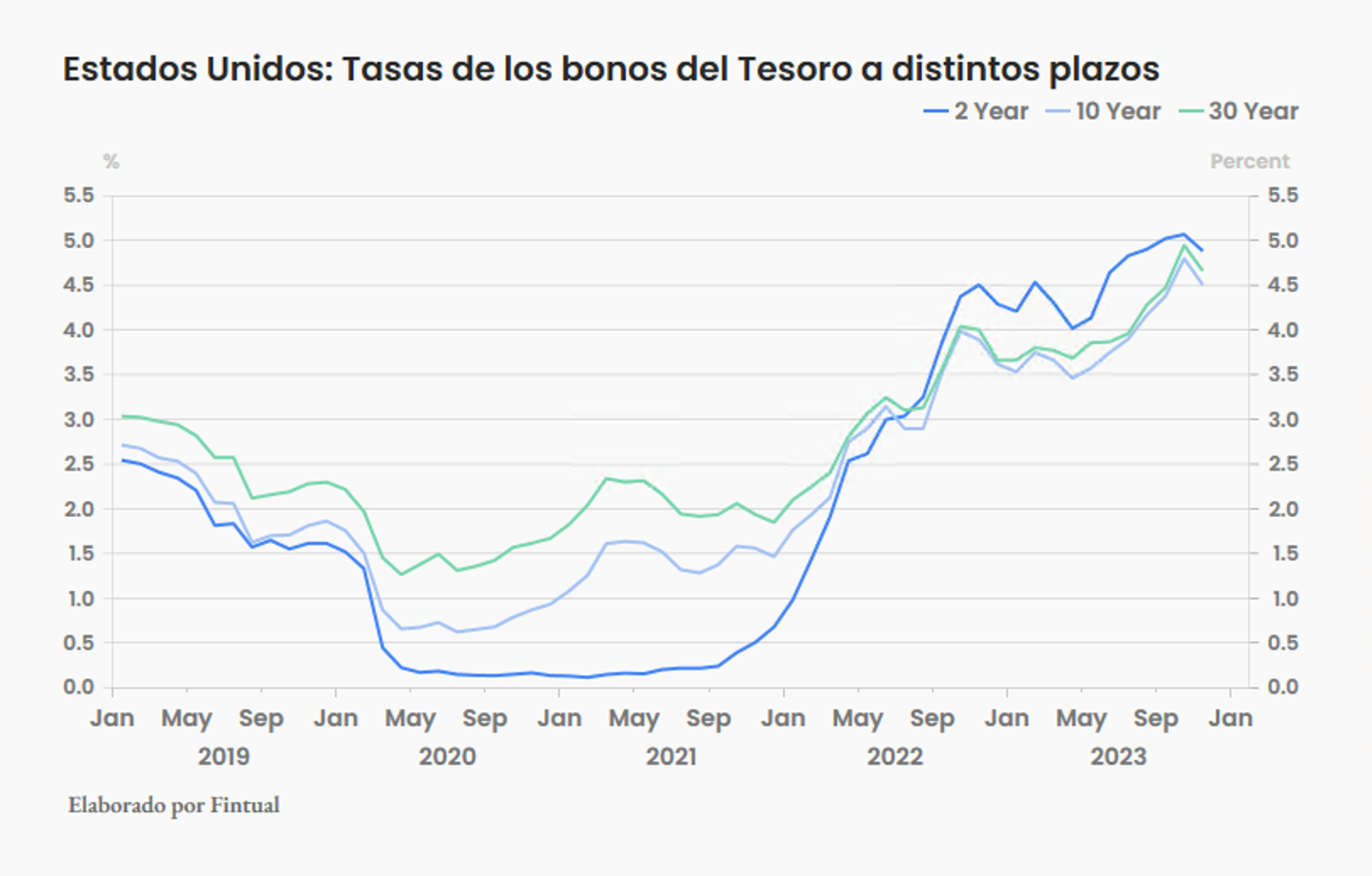 Gran parte de esta caída se le atribuye a la recuperación que ha habido en la demanda de bonos del tesoro de Estados Unidos en las últimas licitaciones públicas. Por otro lado, algunos miembros de la Fed han comunicado visiones menos inflacionarias de cara a los próximos meses, lo cuál podría implicar el fin definitivo de las alzas de tasa por parte de la Fed. Aunque el viernes 1 de diciembre el presidente de la Fed, Jerome Powell, dijo que la puerta para otro aumento de tasas el próximo año no está cerrada y puso paños fríos a las expectativas de recortes pronto.
