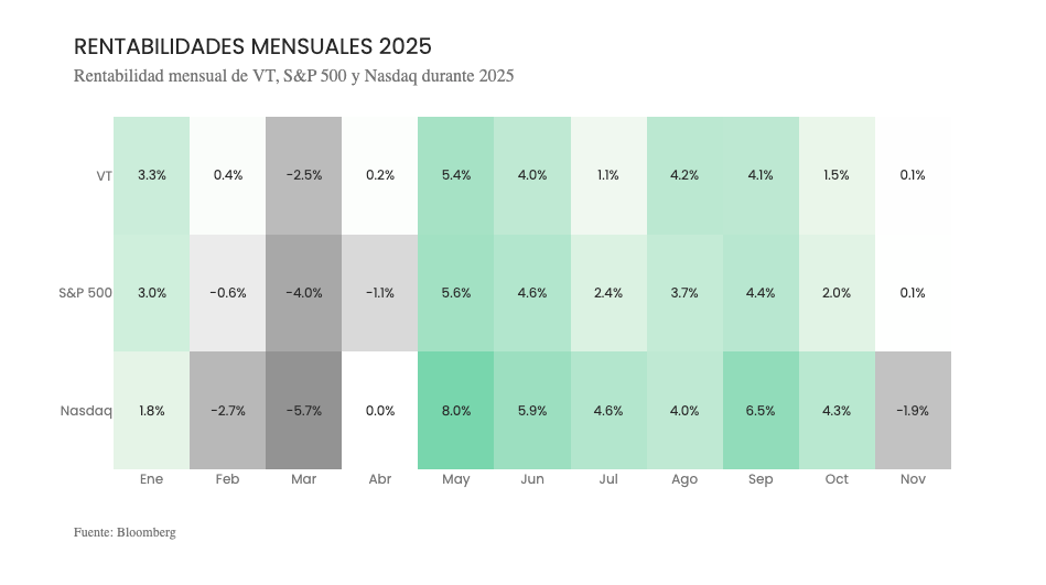 Noviembre fue un mes de rendimientos negativos para los principales índices accionarios, aunque dentro de un año de rendimientos muy buenos.
