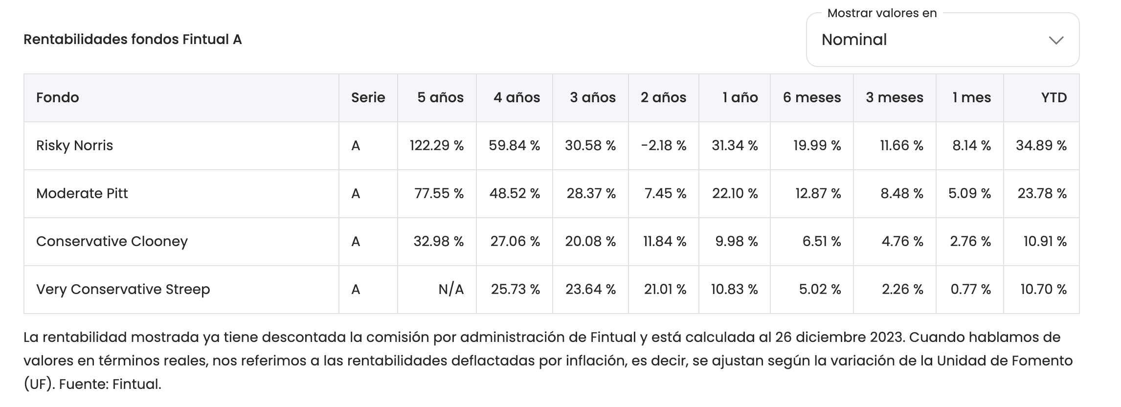 Así, los Fondos de Fintual han tenido un muy buen año, Norris, nuestro fondo de mayor riesgo, rentó 32.6% desde comienzos del año. Esta es la rentabilidad de nuestros fondos hasta fin de año: