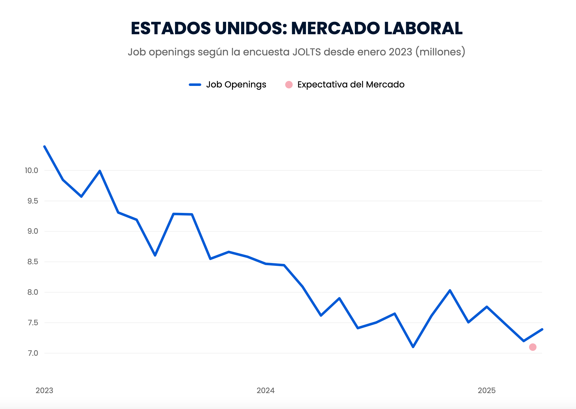 🇺🇸 El martes se publicaron los datos de empleo del BLS (Bureau of Labor Statistics). Las vacantes de empleo que se abrieron en abril superaron a las expectativas.