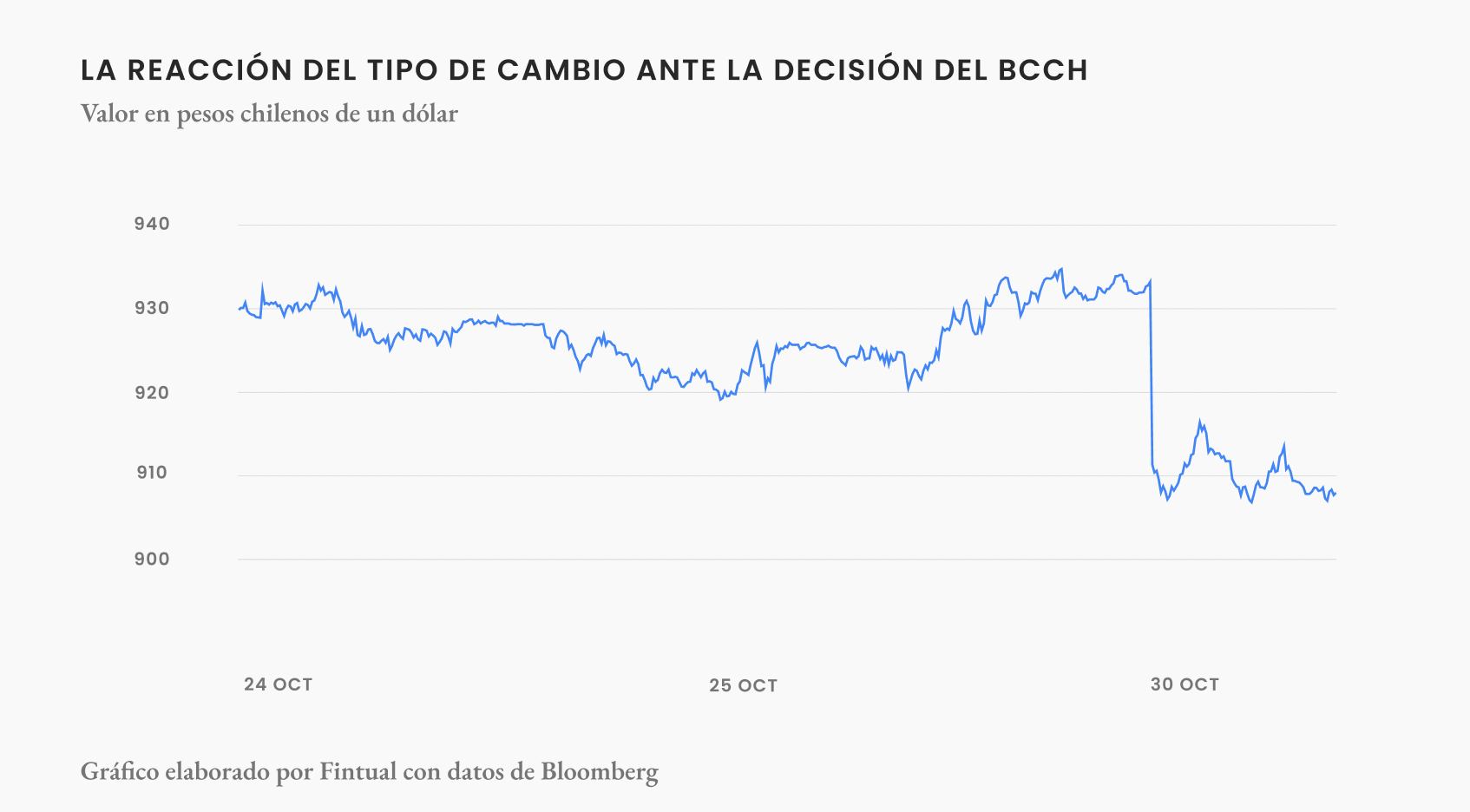 Debido a que tanto el tamaño del recorte como la decisión de suspender la compra de dólares fueron inesperadas para la mayoría del mercado, el lunes el peso chileno se apreció. En corto, lo que pasa es que cuando el BCCh reduce su tasa, el peso chileno suele perder terreno, porque para un inversionista internacional se hace relativamente más atractivo invertir en bonos de otros países. Entonces, la sorpresa de que la tasa no bajará tanto le devuelve a nuestra moneda algo de ese atractivo que había perdido. El impacto inicial fue una apreciación de poco menos del 3%, aunque esta se moderó después de unas horas.