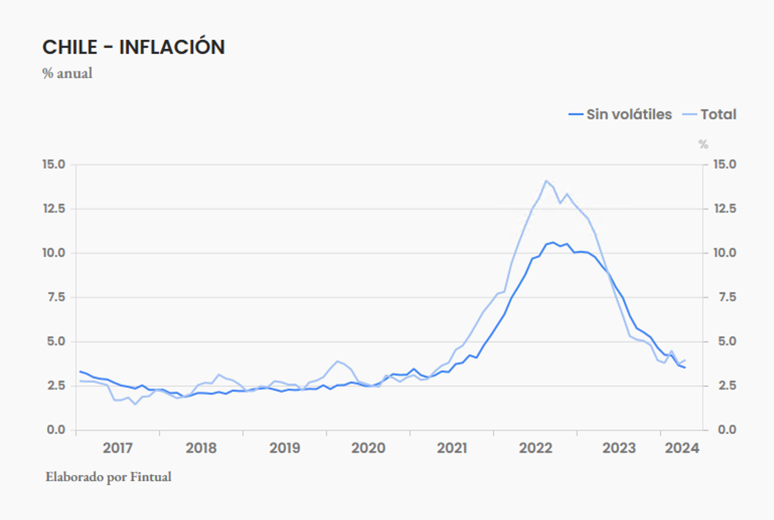 En términos anuales la inflación oficial subió de 3.7% a 4.0%. La inflación sin volátiles siguió bajando, si bien con menos velocidad–disminuyó de 3.8% a 3.7%.