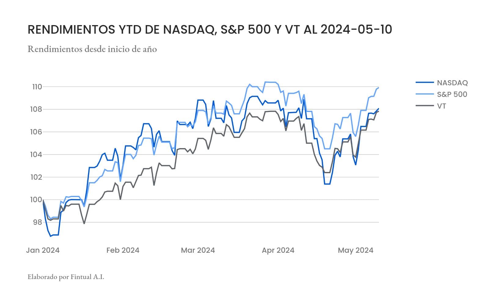 Han sido días buenos para los mercados. Los principales índices de acciones, como el S&P500, el Nasdaq y el índice de acciones globales VT, registraron ganancias de cerca de 4% en los primeros 10 días de mayo.