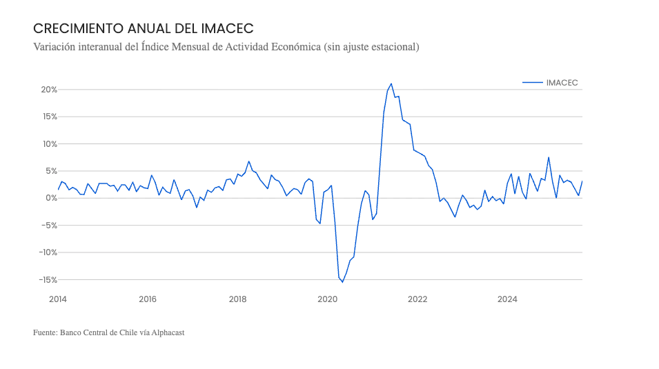 En términos anuales, el Imacec general creció 3,2%, en línea con el consenso de las expectativas del mercado. Sin embargo, al excluir la minería que, en general ha sido en general un lastre para la actividad este año, la economía creció 3,8% en septiembre.