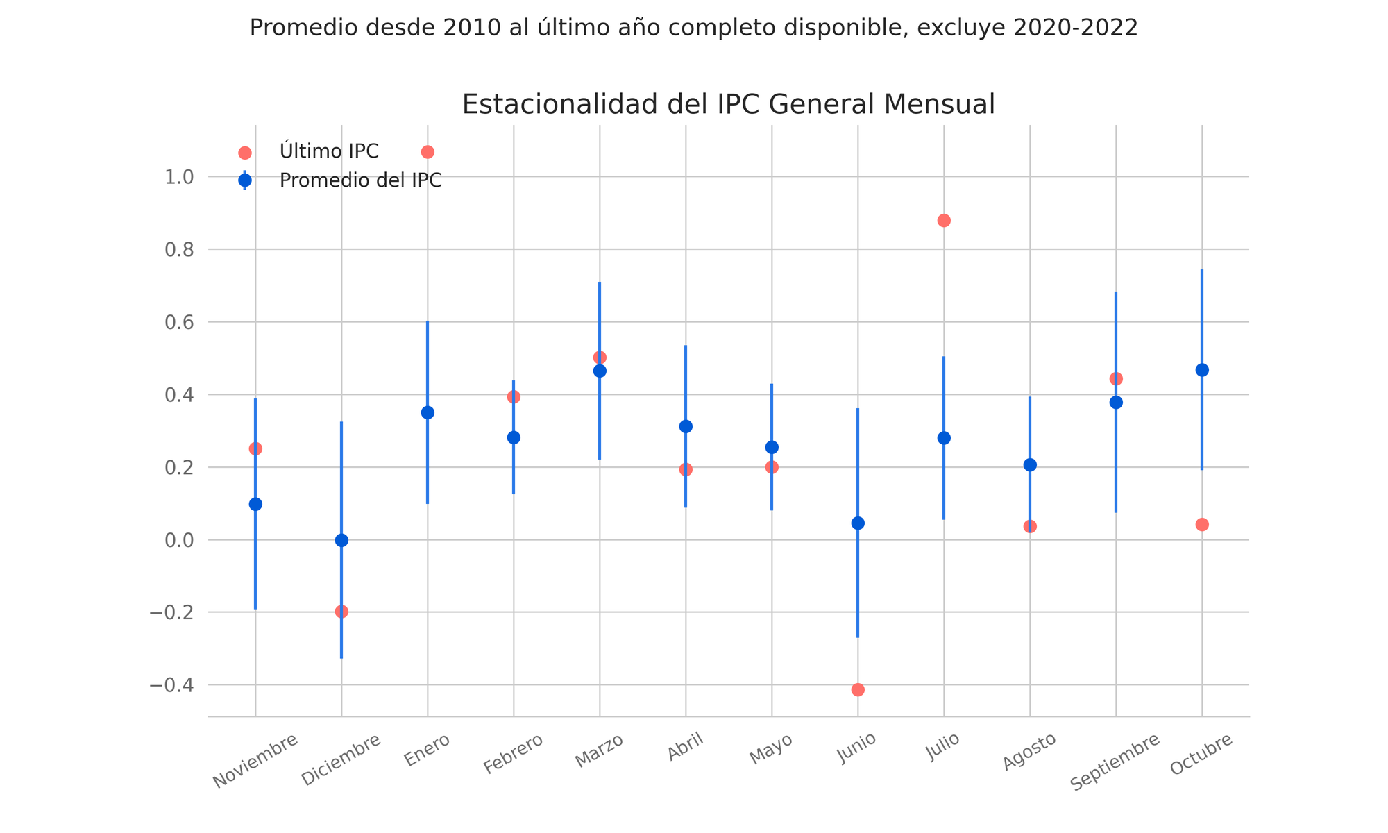 La caída en los precios de los bienes más volátiles contribuyó en mayor medida al acotado avance en la inflación. Sin embargo, también la inflación sin volátiles jugó un rol: esta se contrajo 0,07%, lo cual es excepcionalmente bajo si lo comparamos con el comportamiento habitual de octubre.