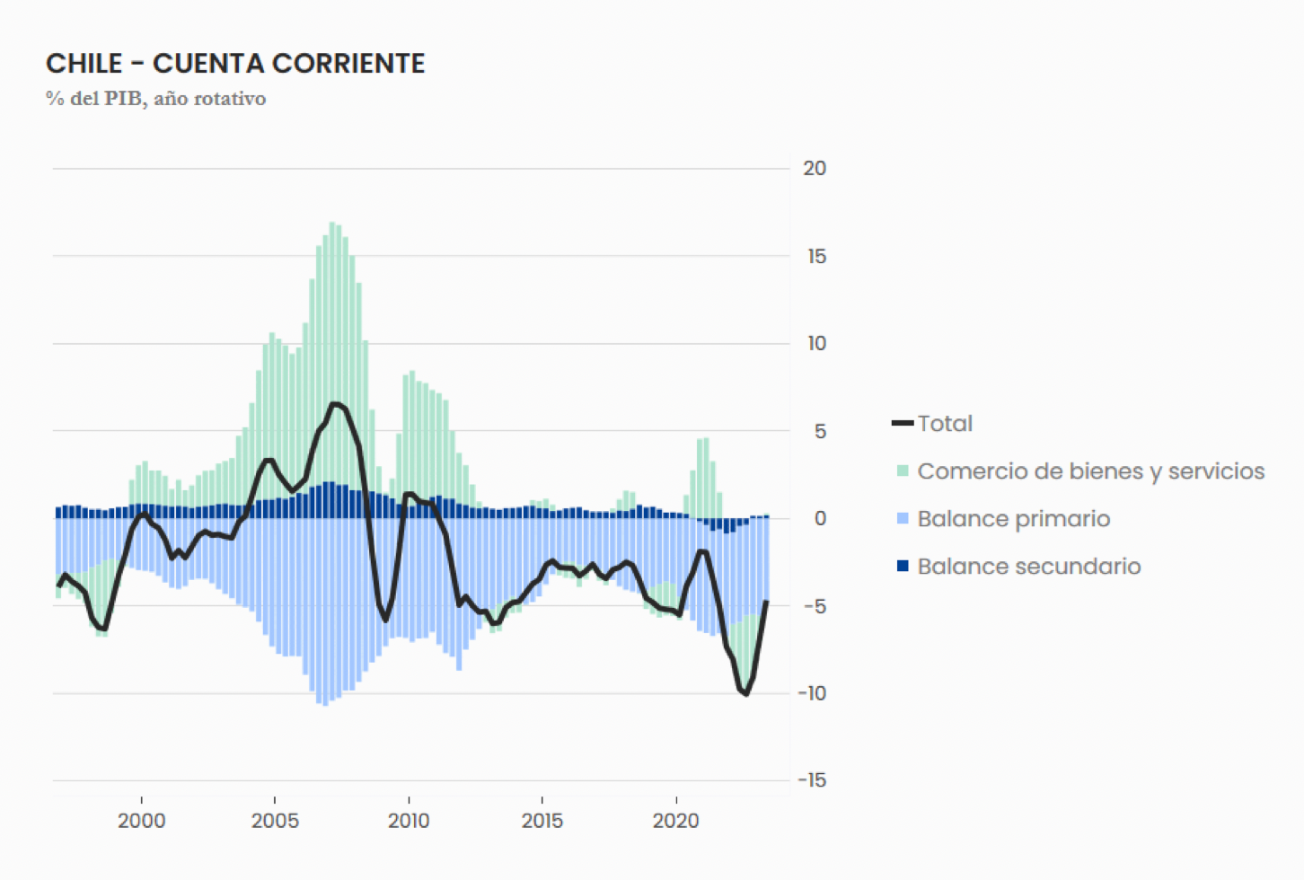 La cuenta corriente se siguió cerrando en el segundo trimestre. Llegó a -4.5% del PIB (después de haber alcanzado -10% el año pasado), a medida que el balance del gobierno pasó a terreno positivo y que sigue disminuyendo el apalancamiento de las empresas no financieras. El espejo de esto es la menor entrada de flujos de portafolio, porque Chile ya no le pide tanta plata al resto del mundo para gastar más de lo que genera.