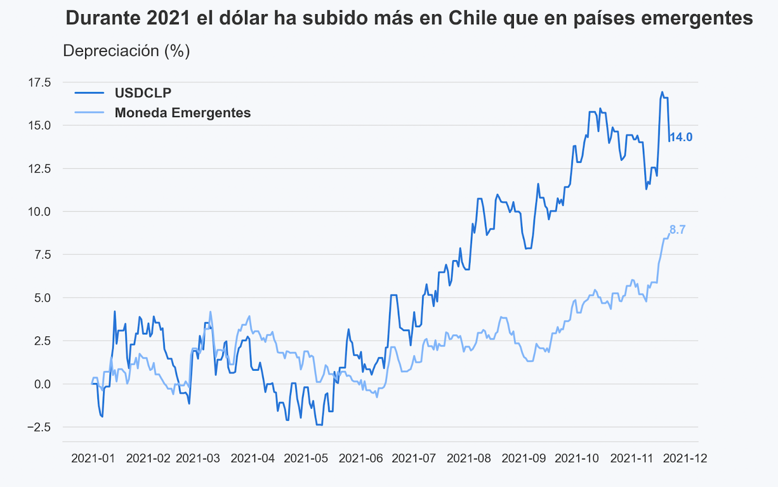 Uno de los principales elementos en una economía globalizada es su moneda, y ante este escenario económico más favorable, el peso chileno se apreció mucho respecto al dólar. O sea, hoy necesitas menos pesos que ayer para comprar un dólar.